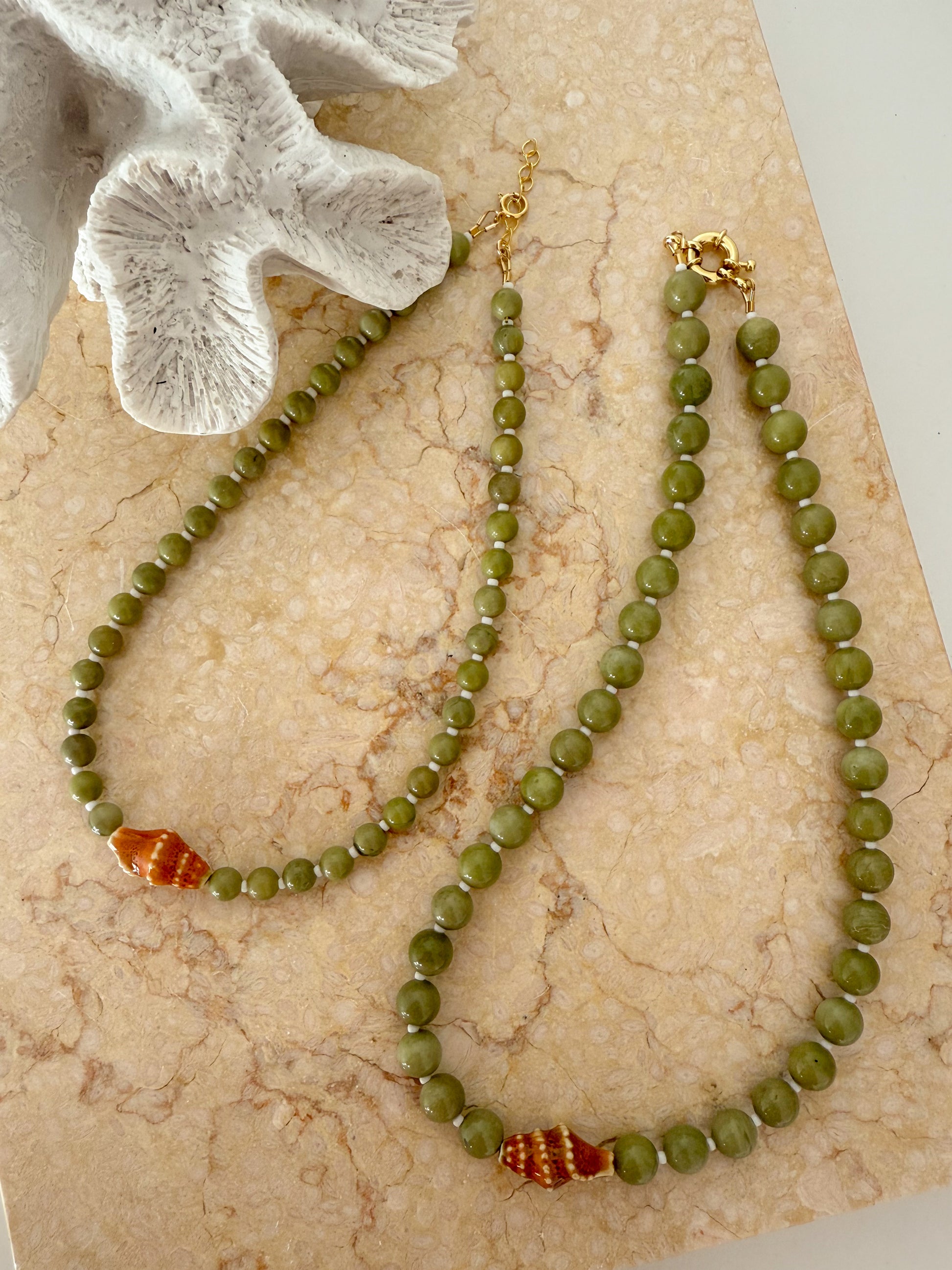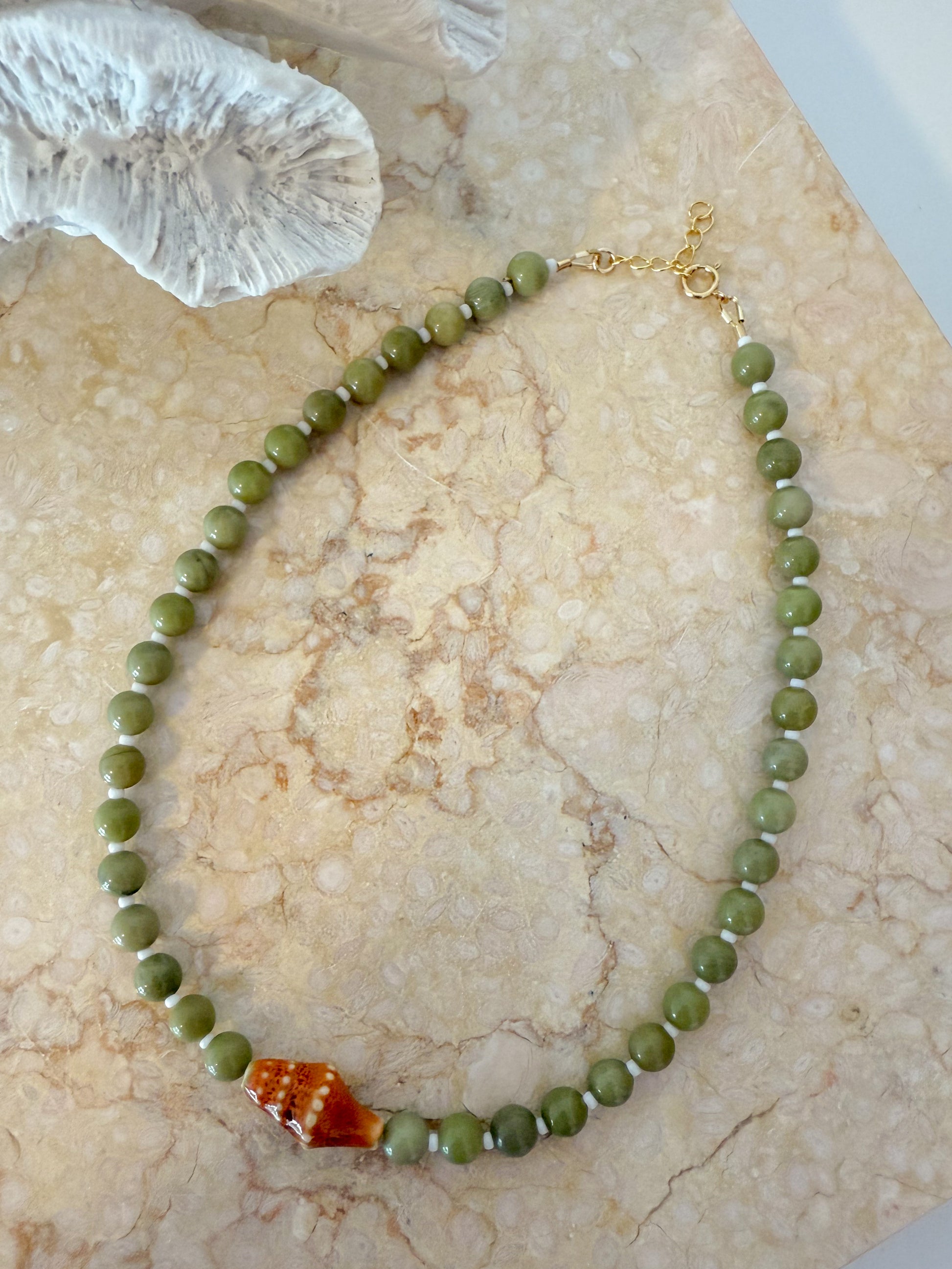 Dive into Disney magic with this enchanting Ariel-inspired necklace! Featuring green gemstone beads paired with delicate white seed beads, this piece captures the essence of the Little Mermaid herself. The standout orange shell bead at the front adds a whimsical coastal charm that'll have you dreaming of underwater adventures. Perfect for Disney fans and mermaid lovers alike, this playful accessory brings a splash of colour and character to any collection.