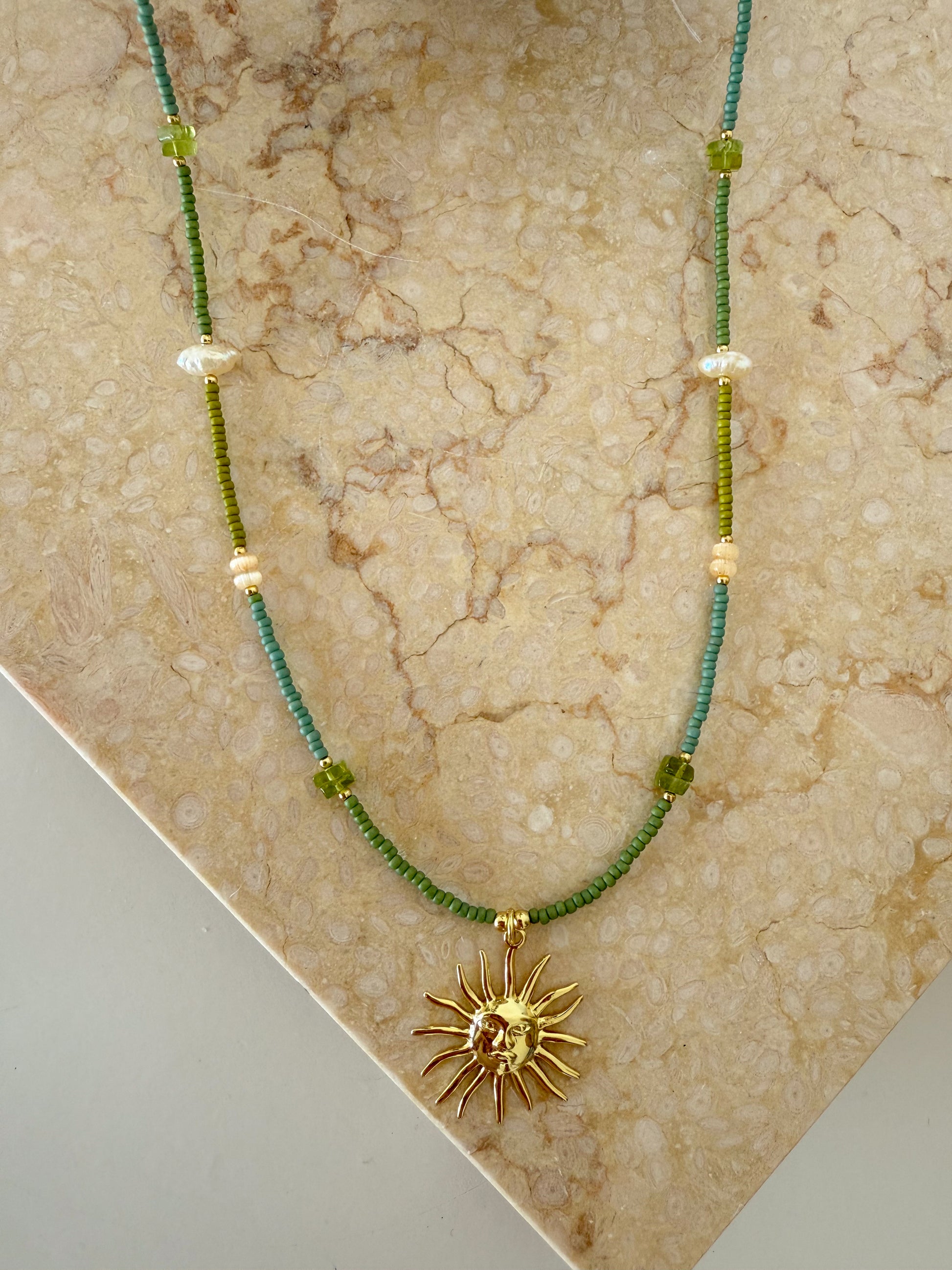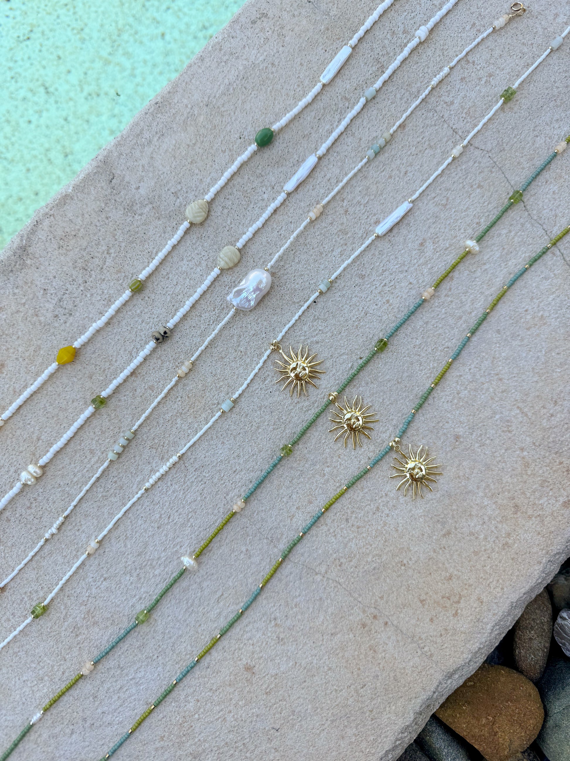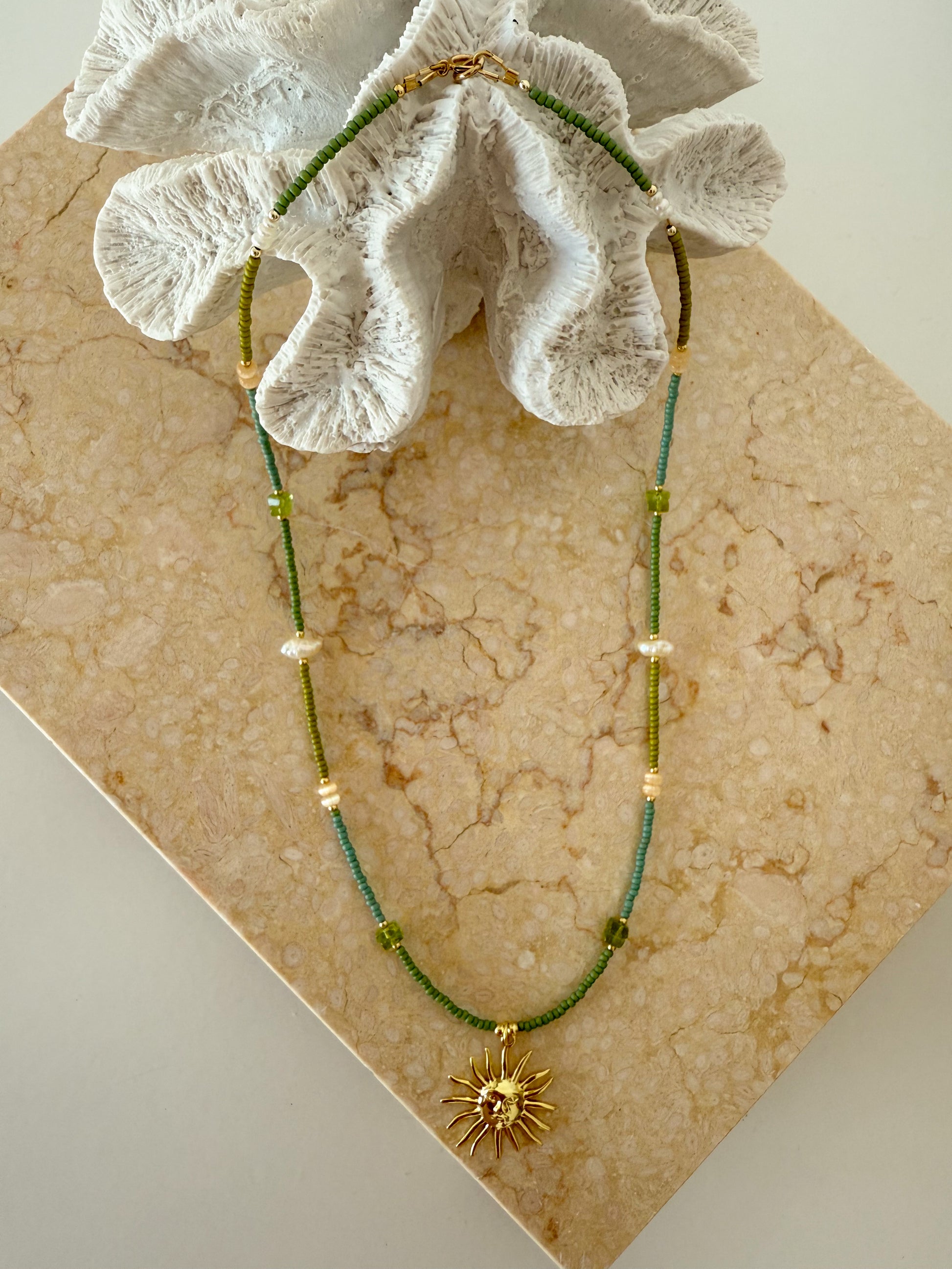 The India necklace expertly blends blue and green seed beads with freshwater pearls and detailed stone and glass beads, offering a textured and vibrant design. Its 18k gold-filled sun pendant provides a luxurious focal point, combining natural elements with refined craftsmanship for an elegant, timeless accessory.