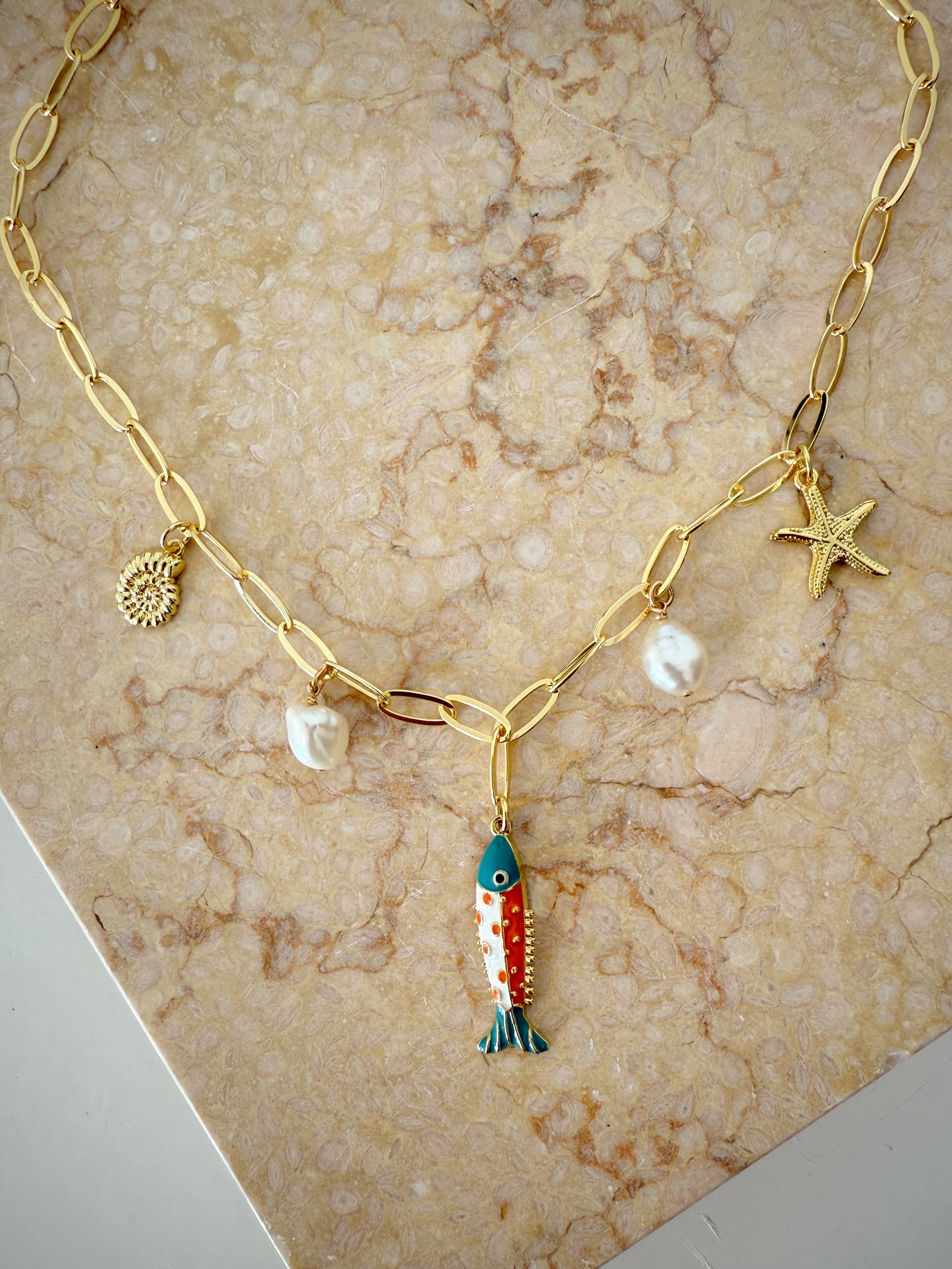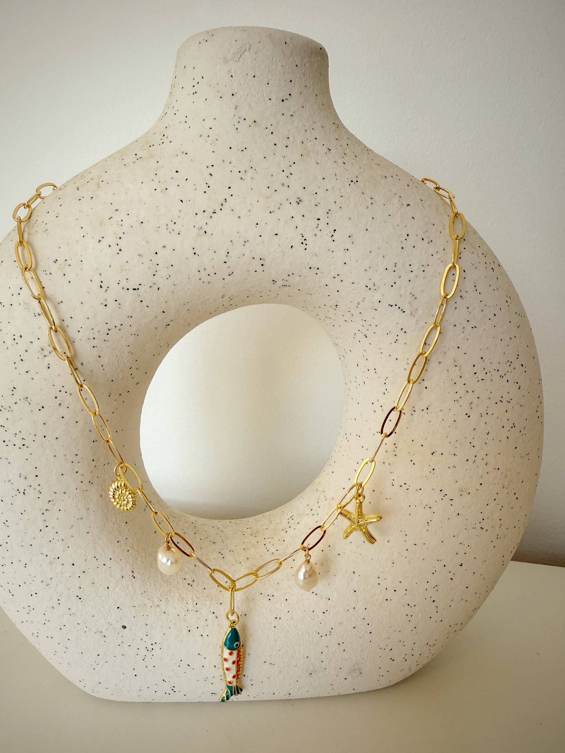 Bring the ocean's magic to your jewellery collection with this enchanting charm necklace. A graceful oval cable chain showcases beautiful ocean and freshwater pearl charms that catch the light with every movement. Whether you're a seaside dreamer or pearl enthusiast, this piece whispers tales of tides and treasures. Layer it with your favourites or let it shine solo!