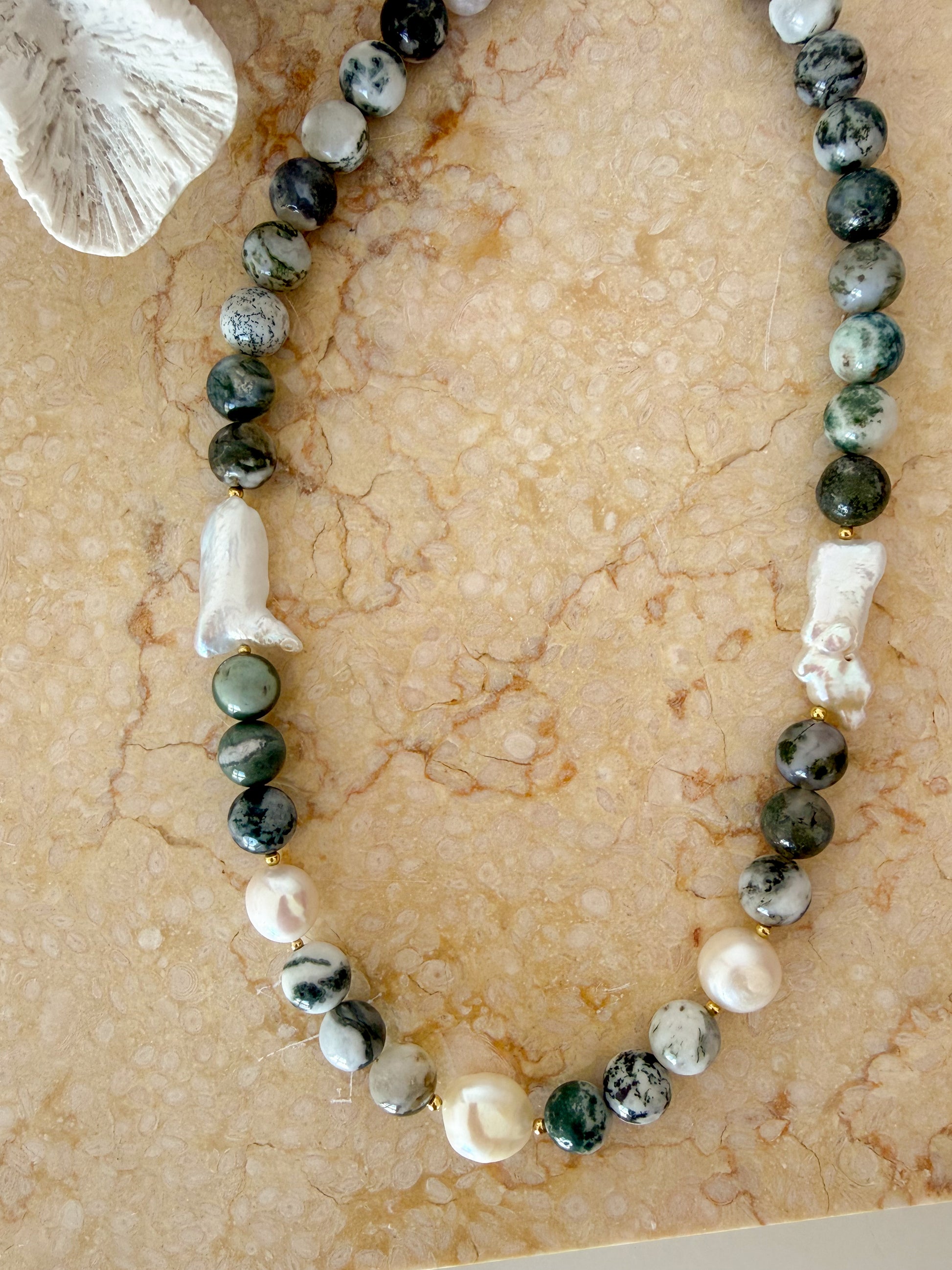 Discover the versatility of The Oceane Necklace, featuring 10mm tree agate gemstone beads paired with delicate freshwater pearl accents. The oval carabiner clasp lets you customise your look, attach your favourite charms or flip it around to reveal an entirely new design. Perfect for layering or wearing solo, this handcrafted piece adapts to your style.