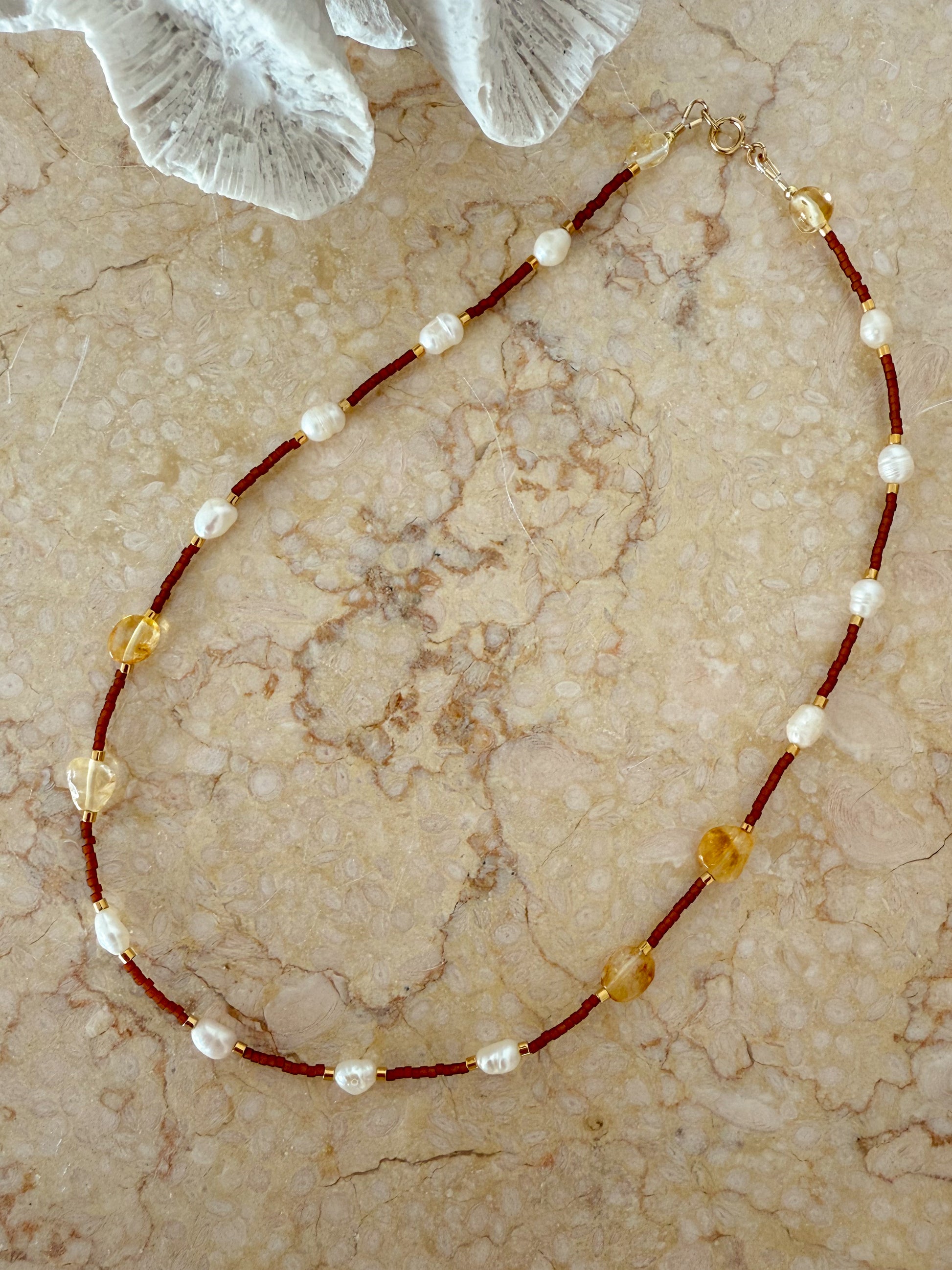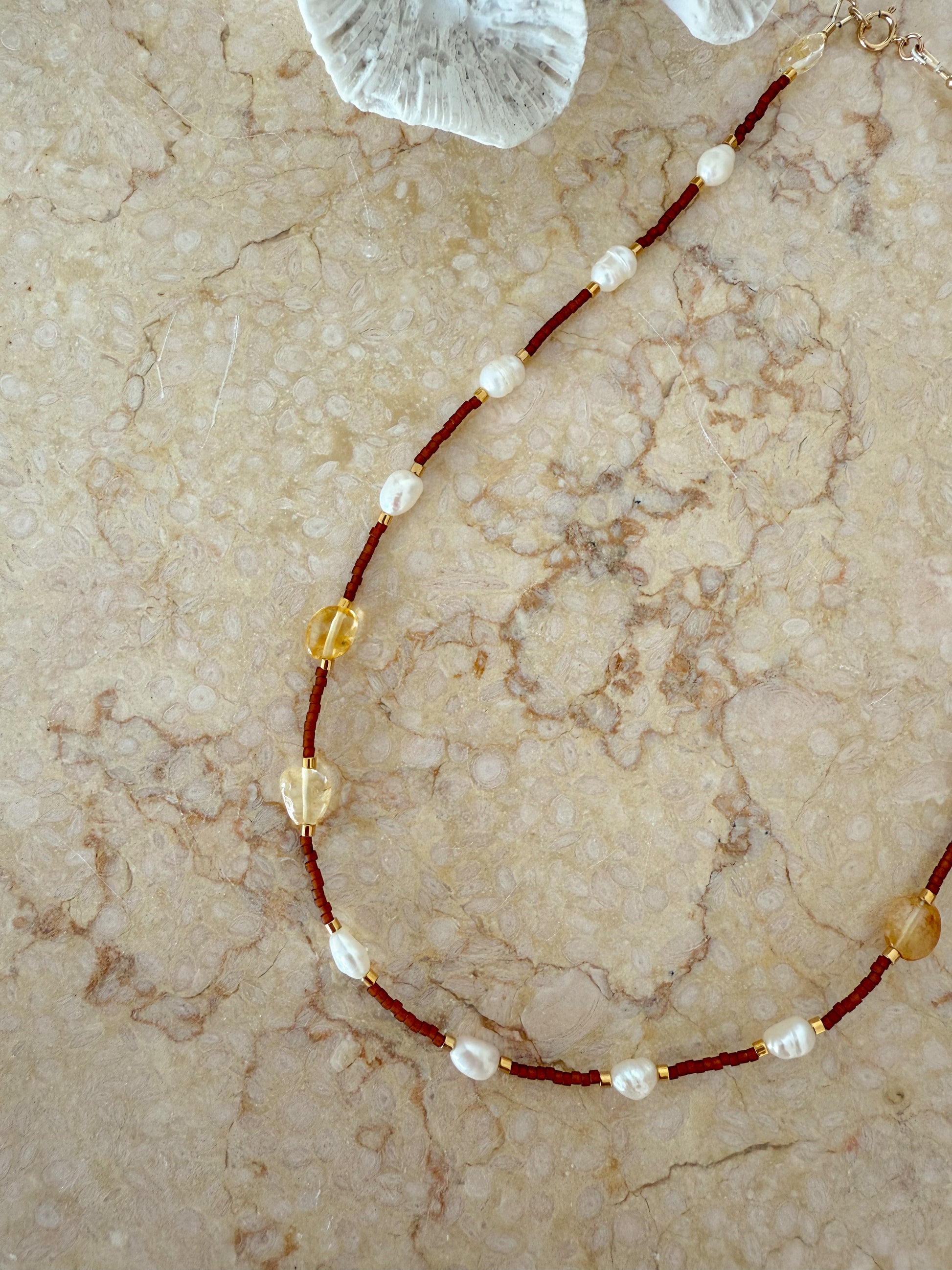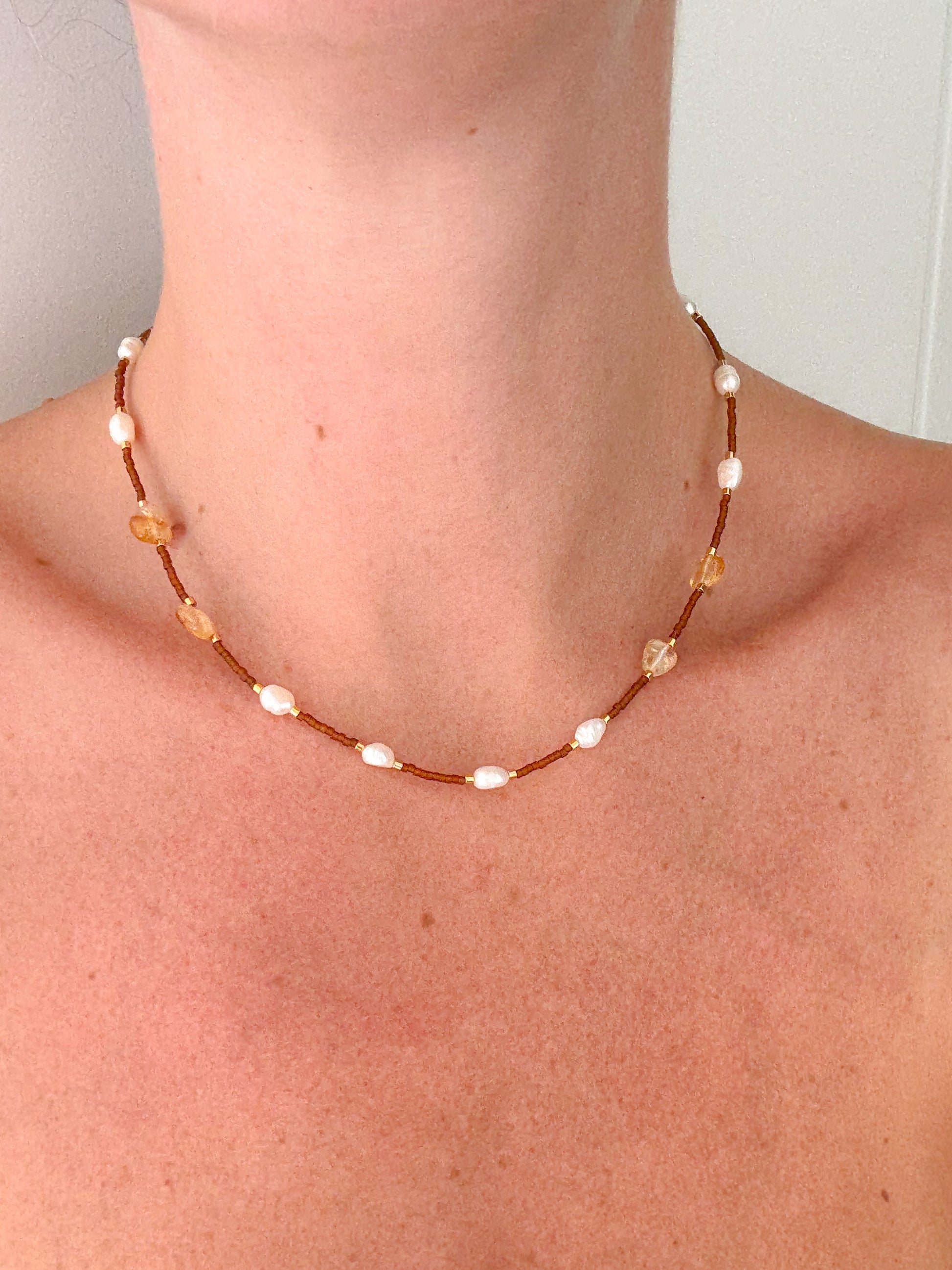 The Millie represents refined artisanal design, combining rich brown and gold seed beads with the serene elegance of freshwater pearls and warm citrine gemstones. The interplay of precious materials creates a sophisticated aesthetic—earthy tones grounded by lustrous accents that catch the light beautifully. Each bead and stone has been carefully positioned to achieve perfect balance, resulting in a piece that speaks to both craftsmanship and timeless style.