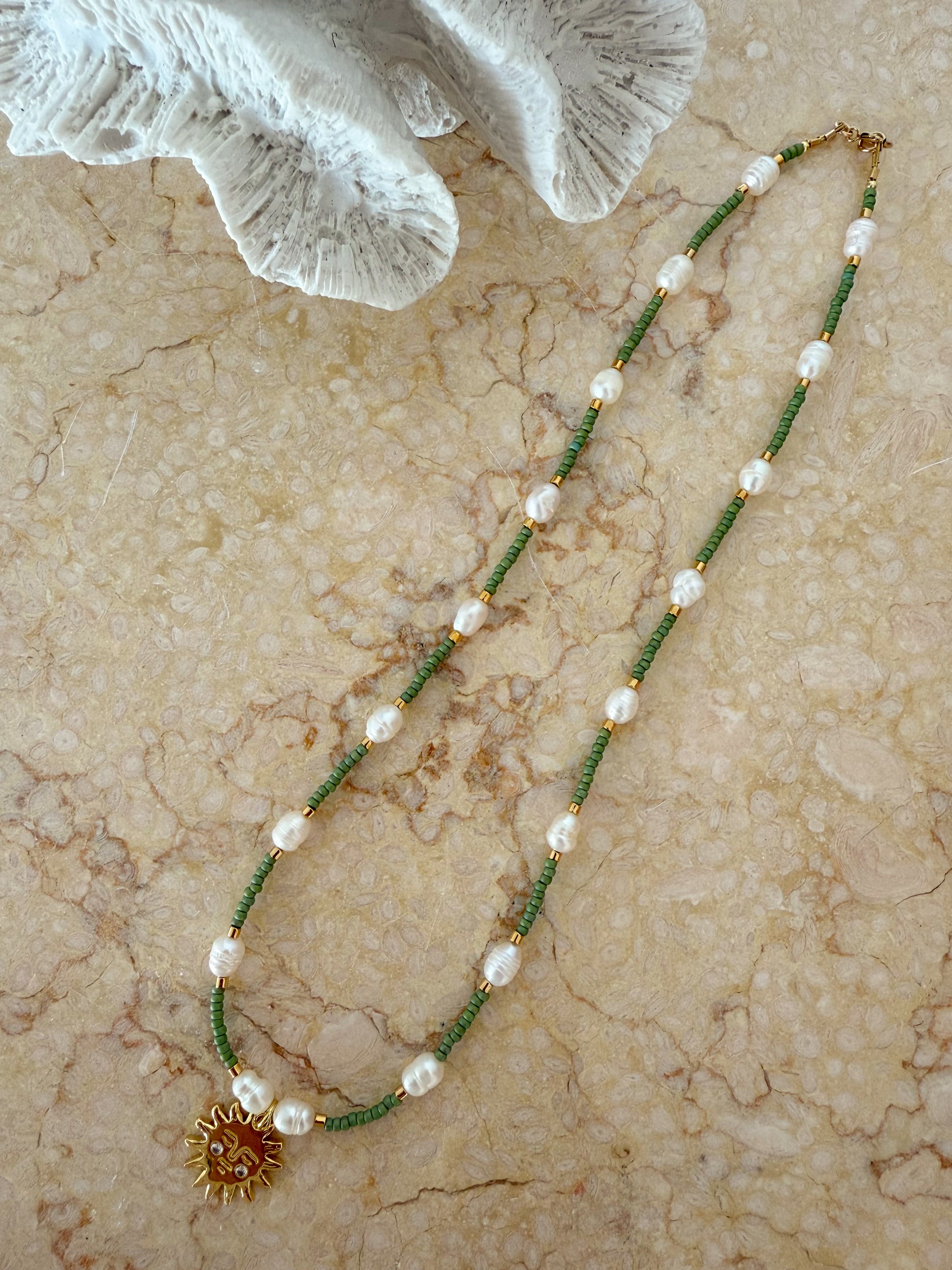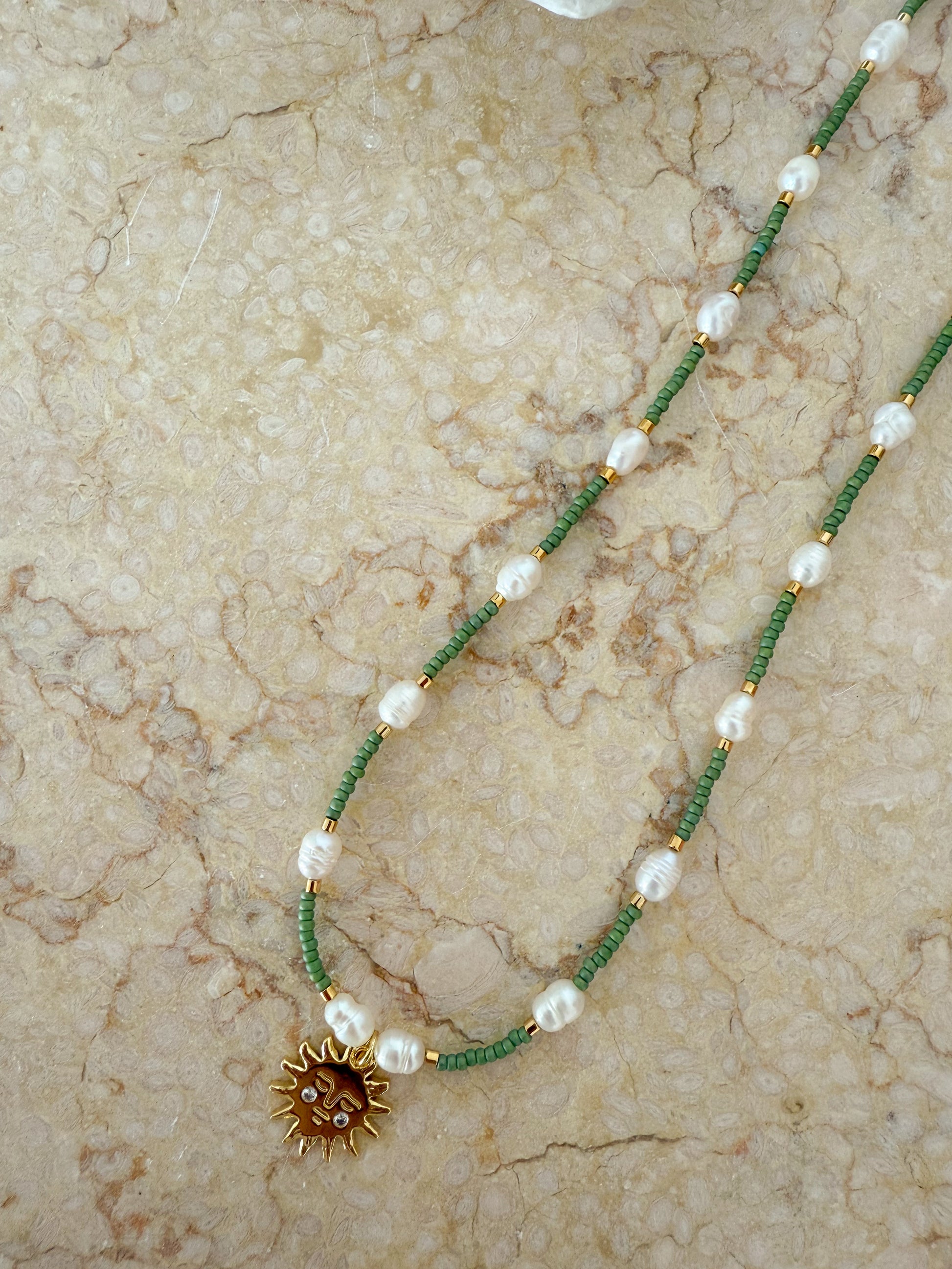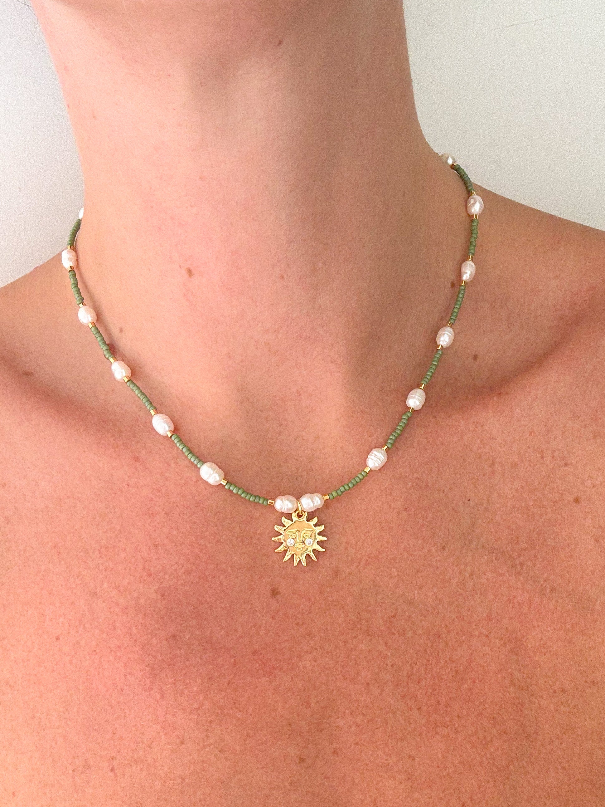 The Palma showcases masterful beadwork with its interplay of verdant green and shimmering gold seed beads, complemented by the serene beauty of freshwater pearls. The composition culminates in an 18k gold-filled sun face pendant—a radiant embellishment that serves as both artistic focal point and symbolic element. This handcrafted creation demonstrates exceptional attention to material selection and construction, resulting in a piece that balances natural warmth with refined sophistication.