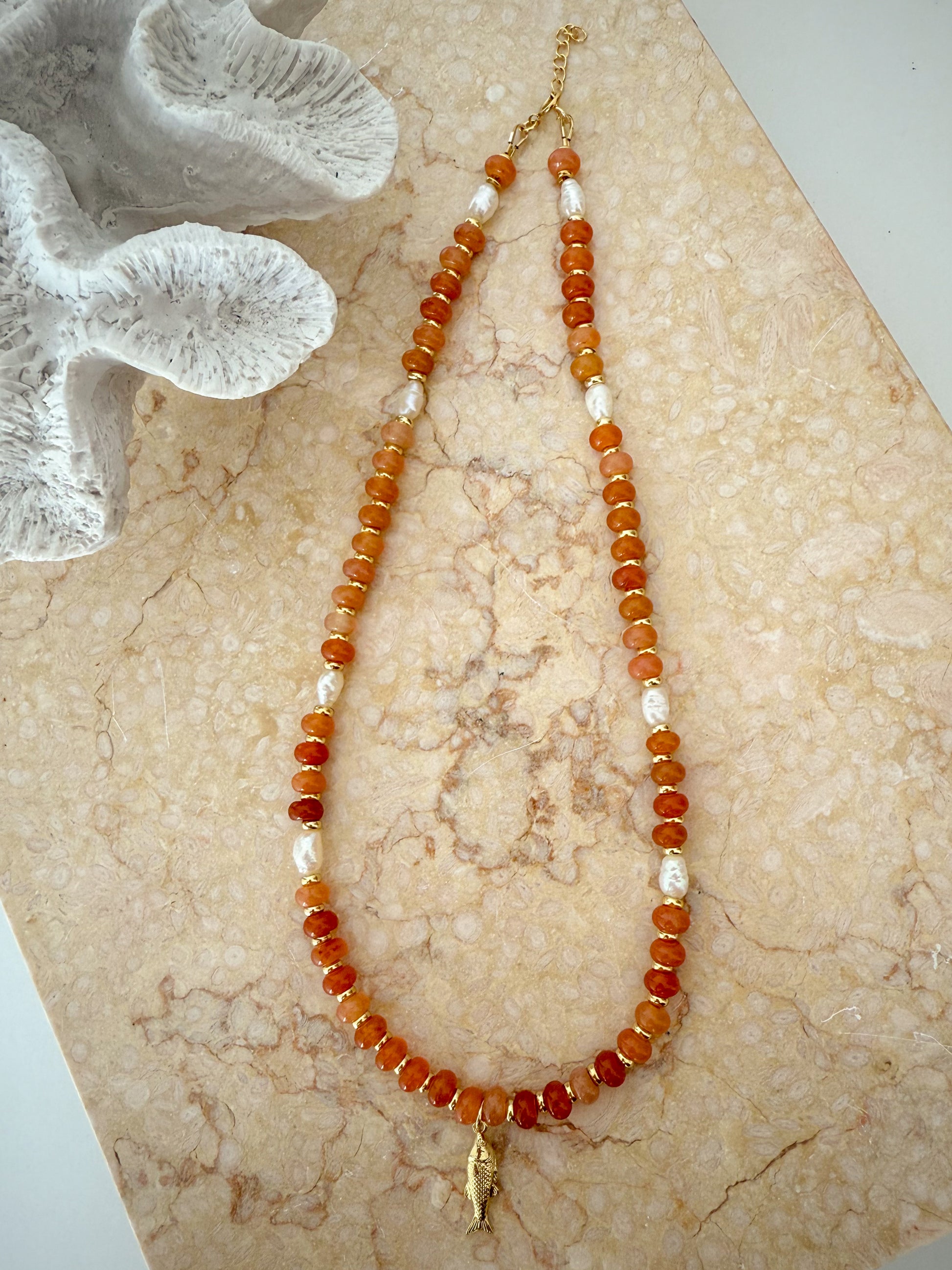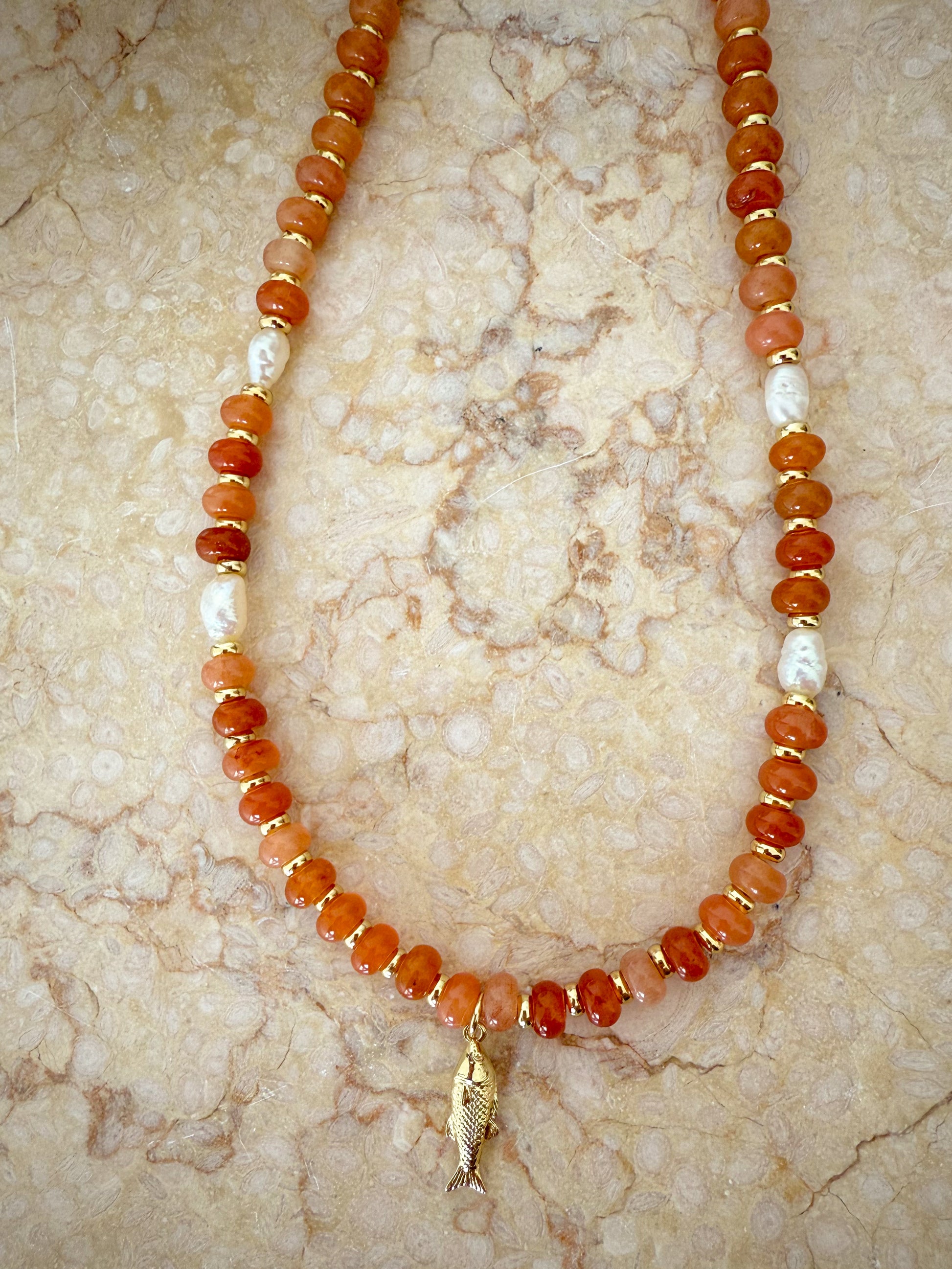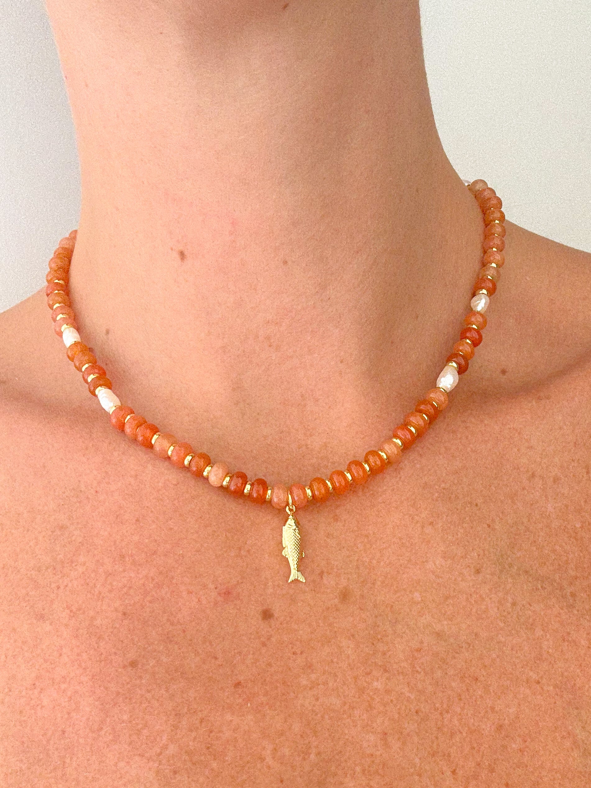 Say hello to The Romy - a delightfully quirky necklace that celebrates all things whimsical and wonderful! Earthy 6mm rondelle beads create a natural, grounded foundation, while lustrous freshwater pearl accents add a touch of understated elegance. The playful fish pendant at the front brings personality and charm, making this the perfect piece for ocean lovers and free spirits alike. Lightweight and versatile, The Romy is your new favourite accessory for adding a splash of joy to any day.