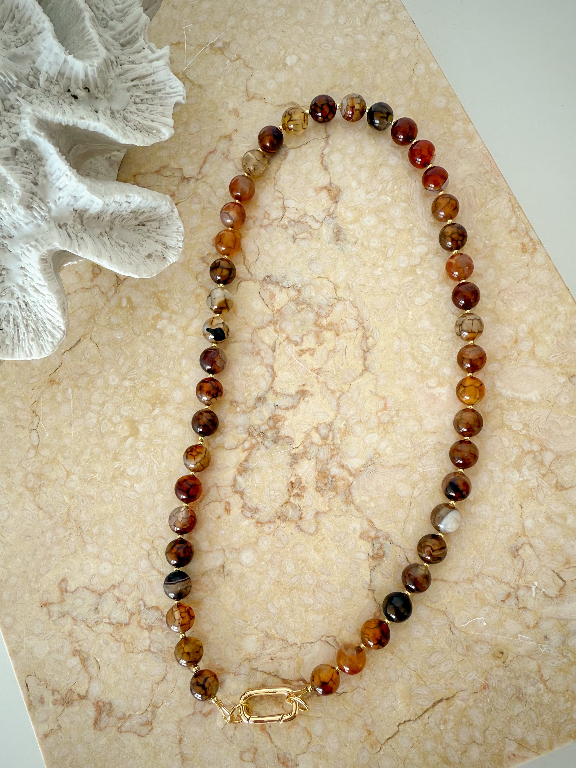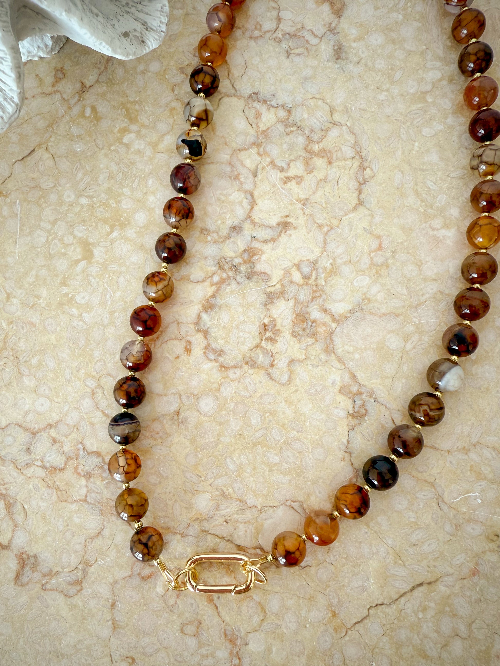 Introducing The Chloe - a versatile beauty that's as flexible as your style! Gorgeous 8mm dragon vein gemstone beads showcase mesmerising patterns and earthy hues, accented with gleaming gold details throughout. The standout feature? An oval carabiner clasp that lets you customise your look by adding your favourite charm whenever the mood strikes. Wear it forwards, backwards, or switch it up daily, this necklace adapts to your playful personality. Perfect for those who love options and aren't afraid to mix things up.