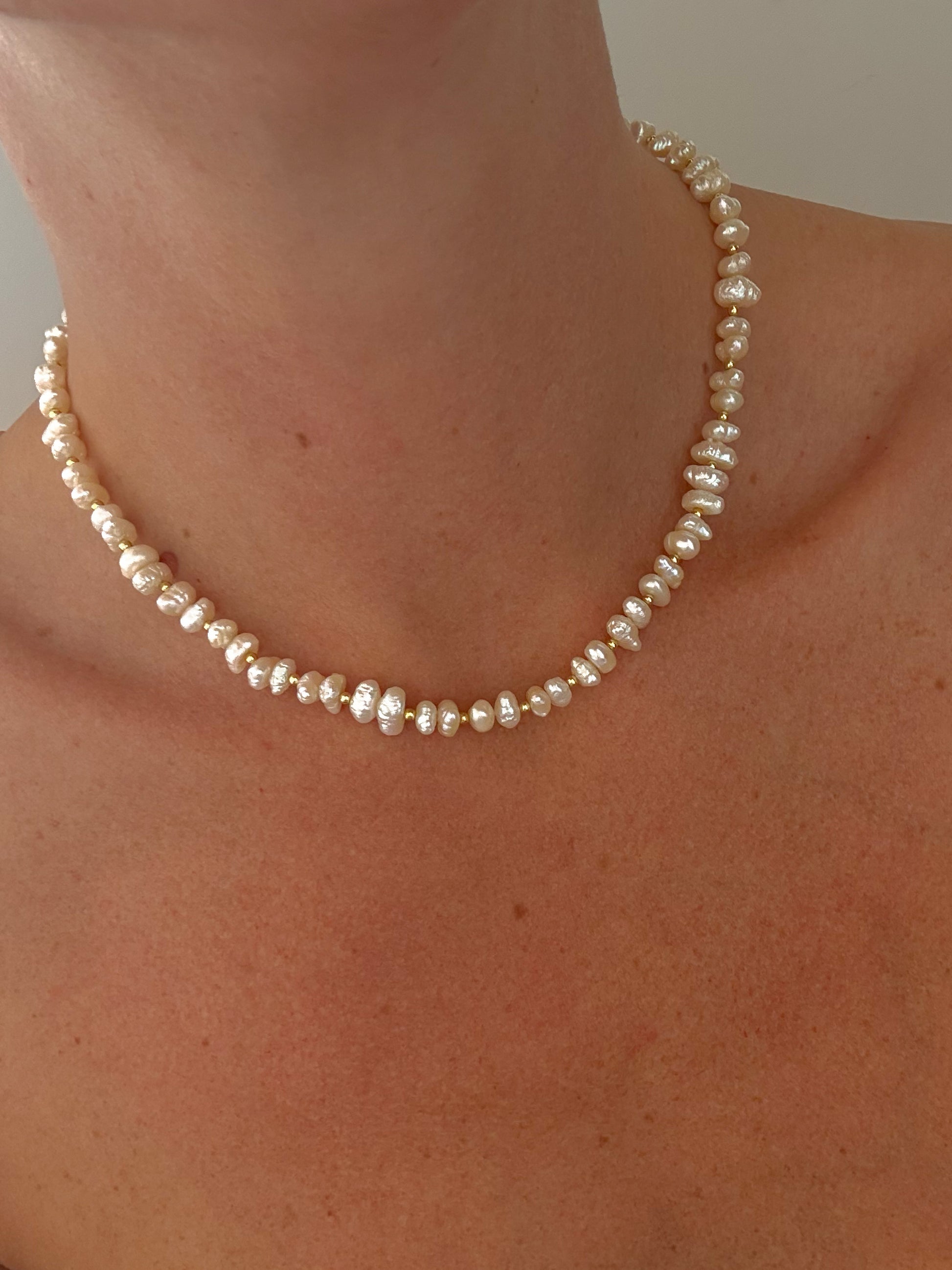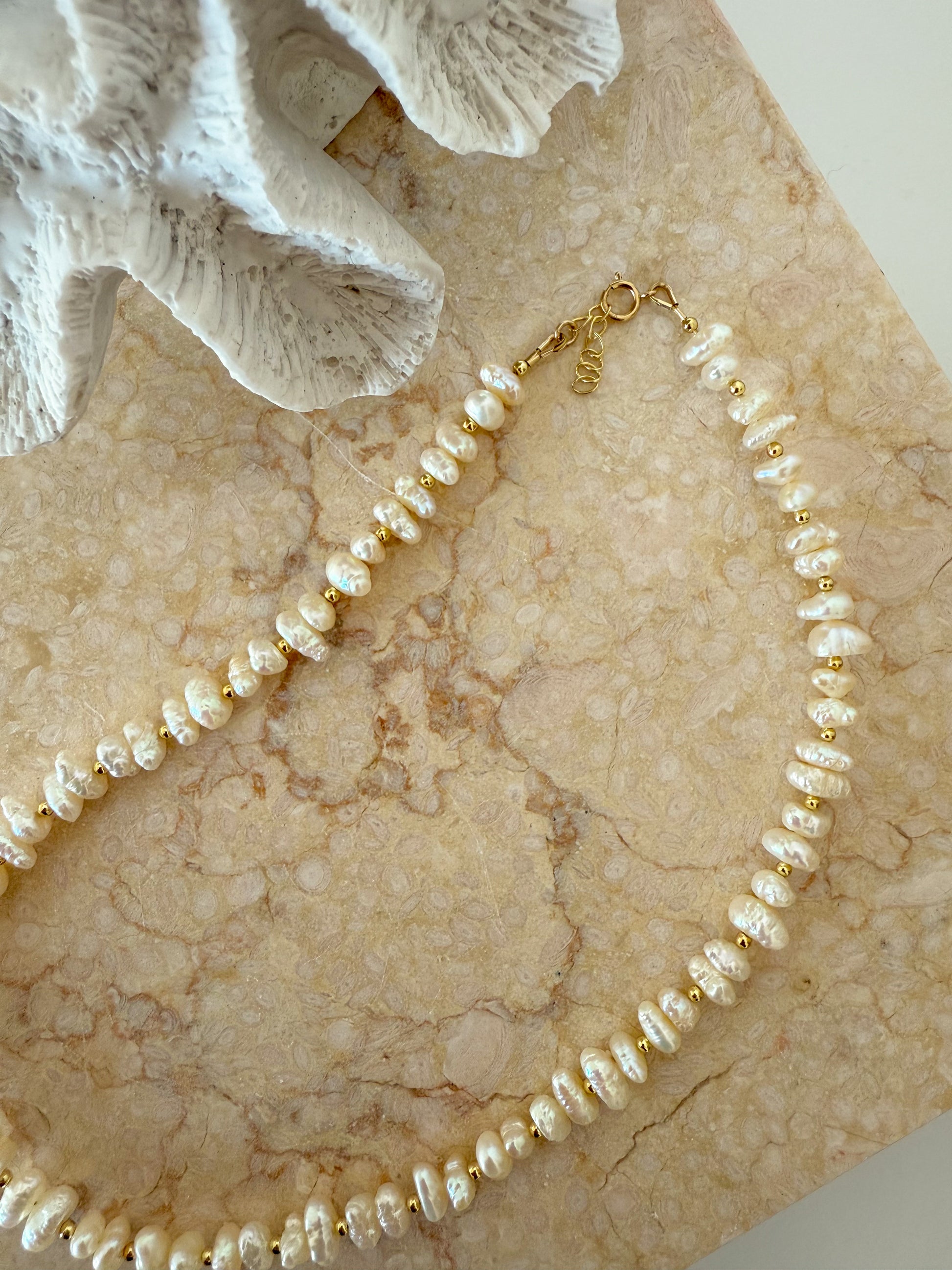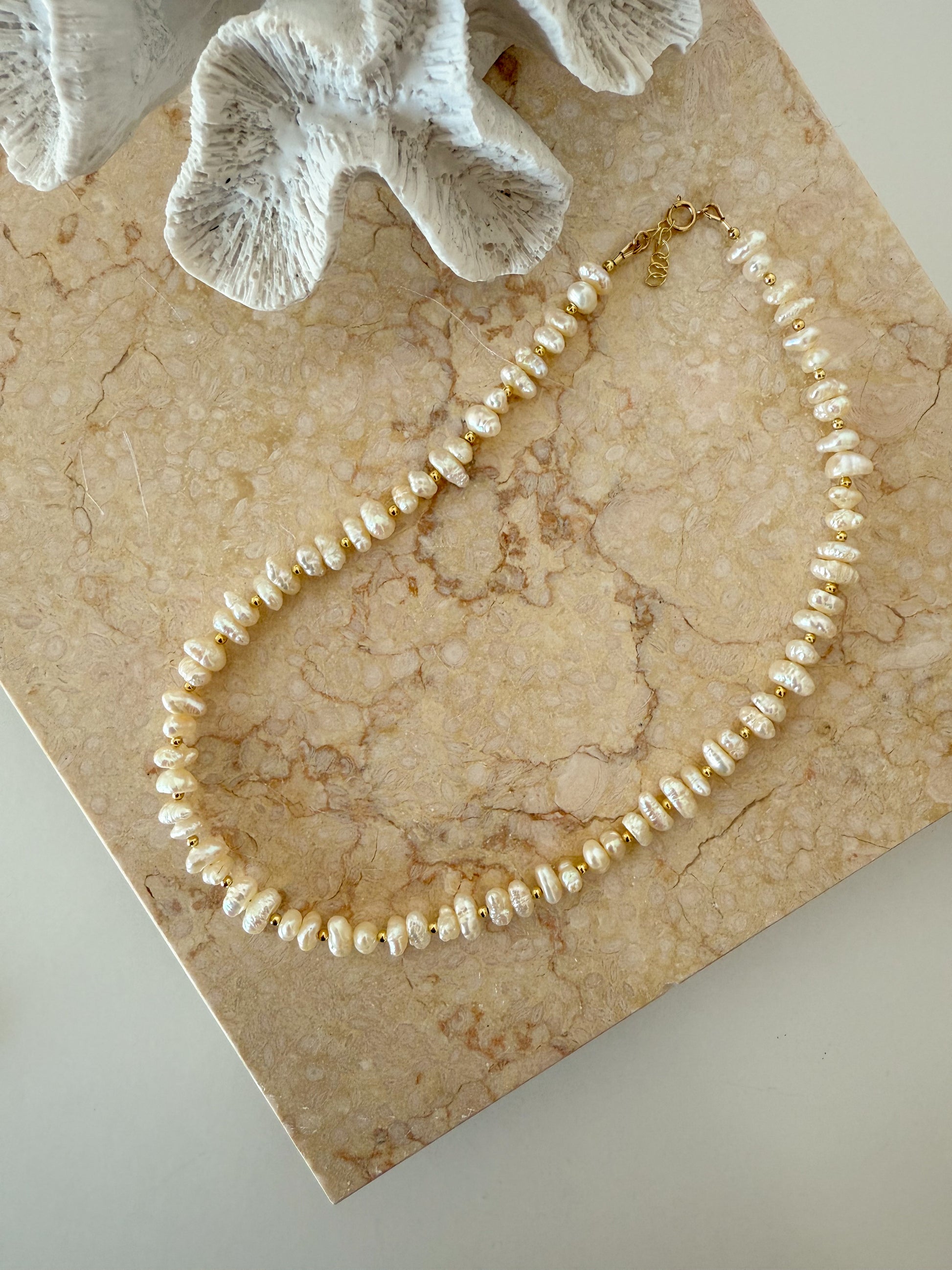 This elegant accessory showcases lustrous 6-7mm freshwater rice pearls, expertly paired with subtle gold spacer beads to enhance its classic appeal. Its timeless design makes it a versatile addition, suitable for both everyday wear and special occasions, adding a refined touch to any ensemble. Crafted with attention to detail, this piece balances sophistication with understated charm.