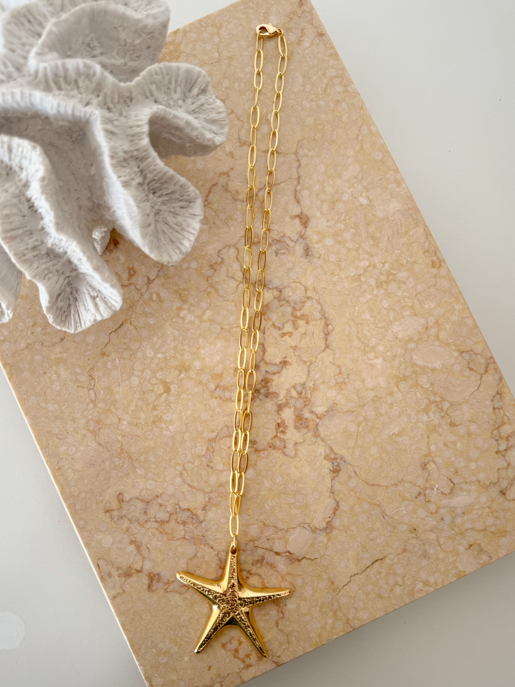 Make a splash with this statement piece featuring an oversized starfish pendant suspended from a delicate oval cable chain in gleaming gold. Perfect for channeling coastal vibes or adding a touch of whimsy to your everyday style. Whether you're dreaming of sandy shores or just love a bold accessory, this beauty demands attention and delivers pure joy!