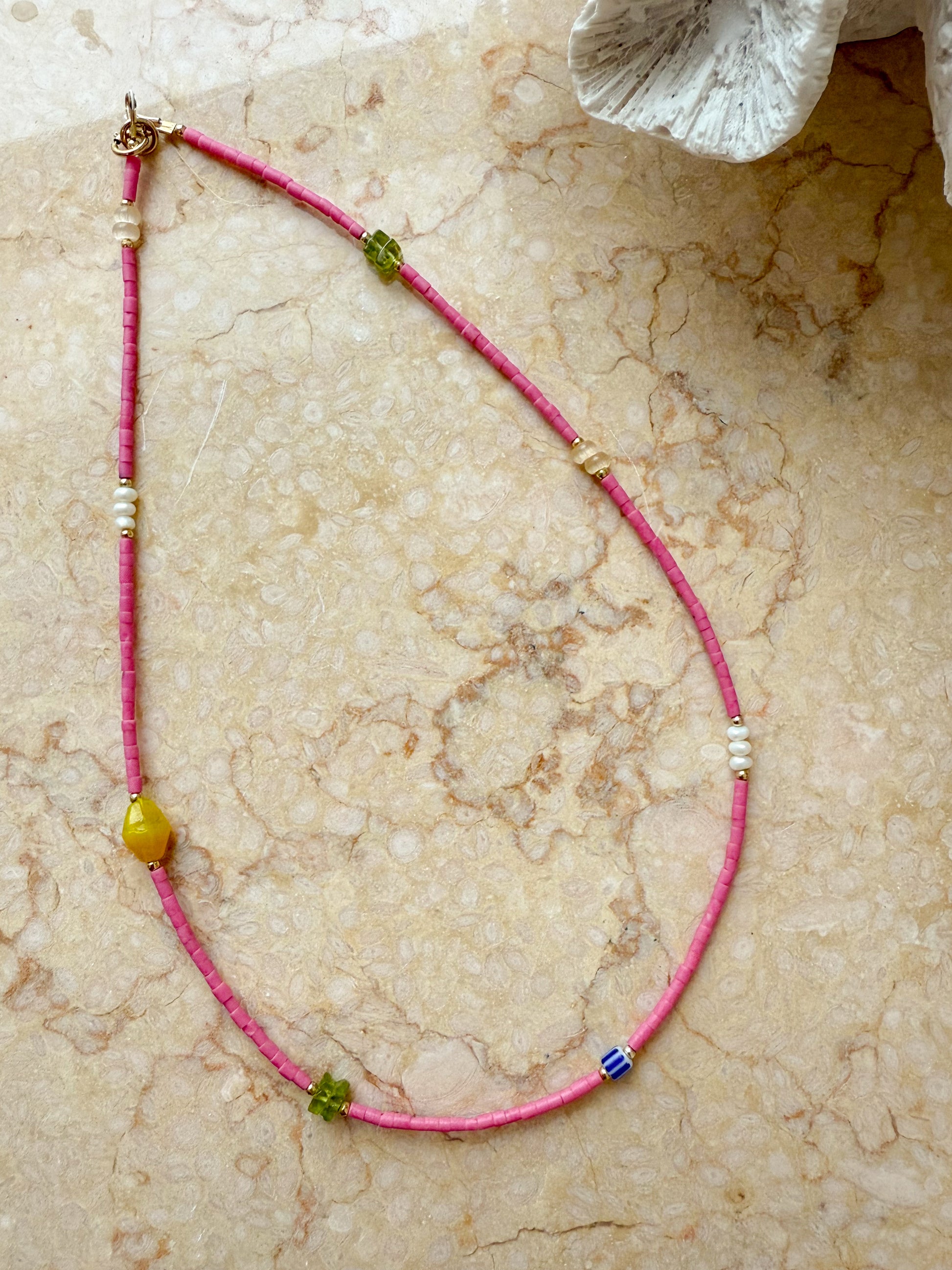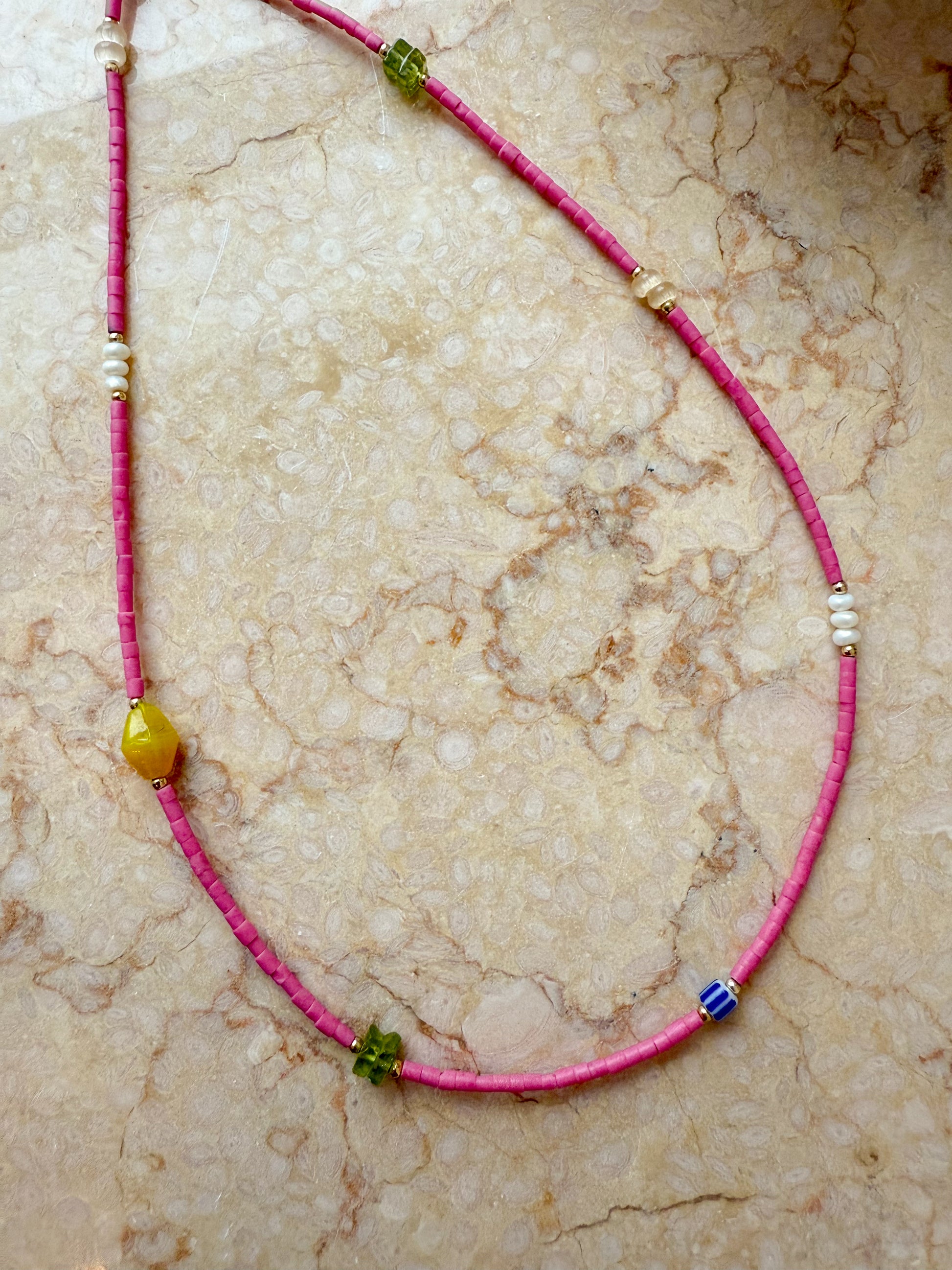Tiny pink seed beads team up with an assortment of mixed beads and freshwater pearls to create a piece bursting with personality. This cheerful accessory celebrates the beauty of layered textures and soft, dreamy hues. Whether you're dressing up or keeping it casual, it's the perfect companion for adding a hint of playful elegance to your day.