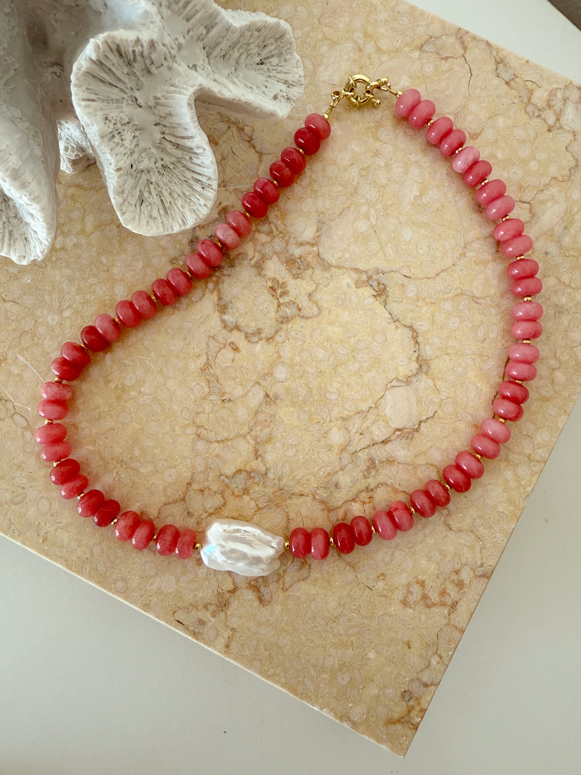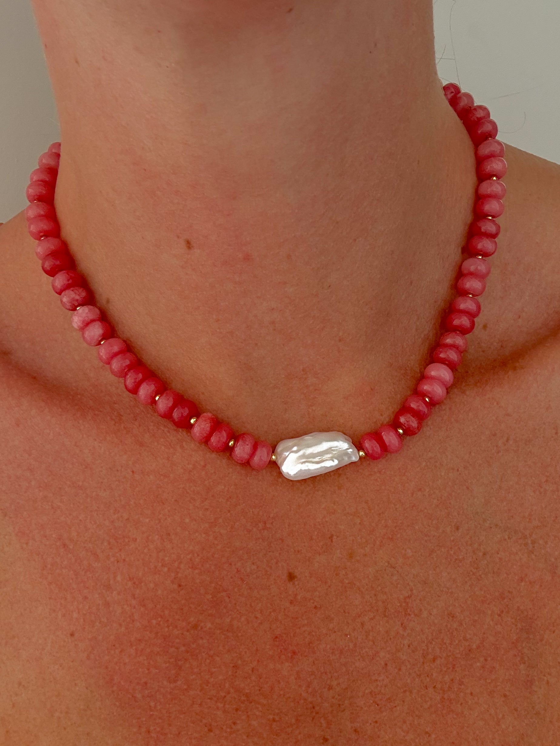 The Keira features exquisite pink jade rondelle beads accented with elegant gold detailing, culminating in a striking front Biwa freshwater pearl. This combination offers a sophisticated balance of natural beauty and refined craftsmanship, perfect for those seeking a unique and timeless statement piece.
