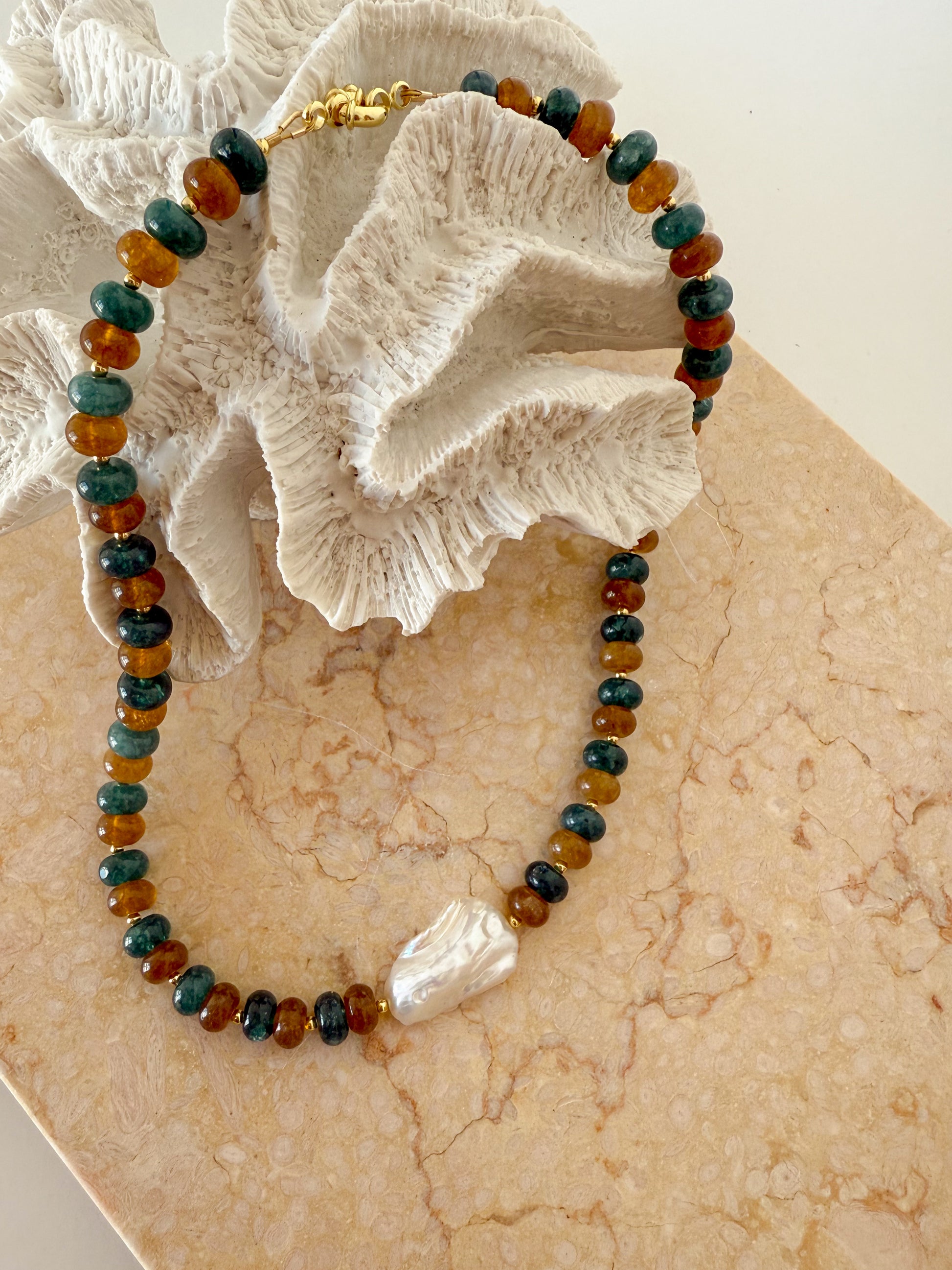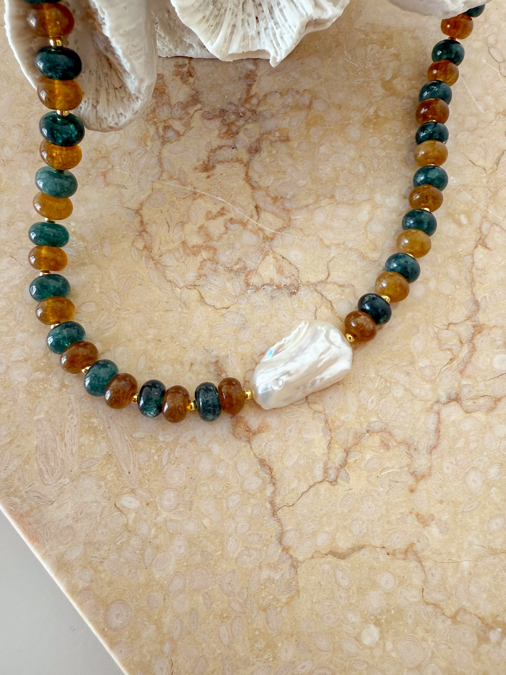 The Olivia necklace showcases a refined blend of brown and blue rondelle beads accented by subtle spacer beads, highlighting a luminous Biwa freshwater pearl at its center. Expertly crafted and finished with durable gold-filled fittings, this piece offers both elegance and lasting quality, perfect for elevating sophisticated wardrobes.
