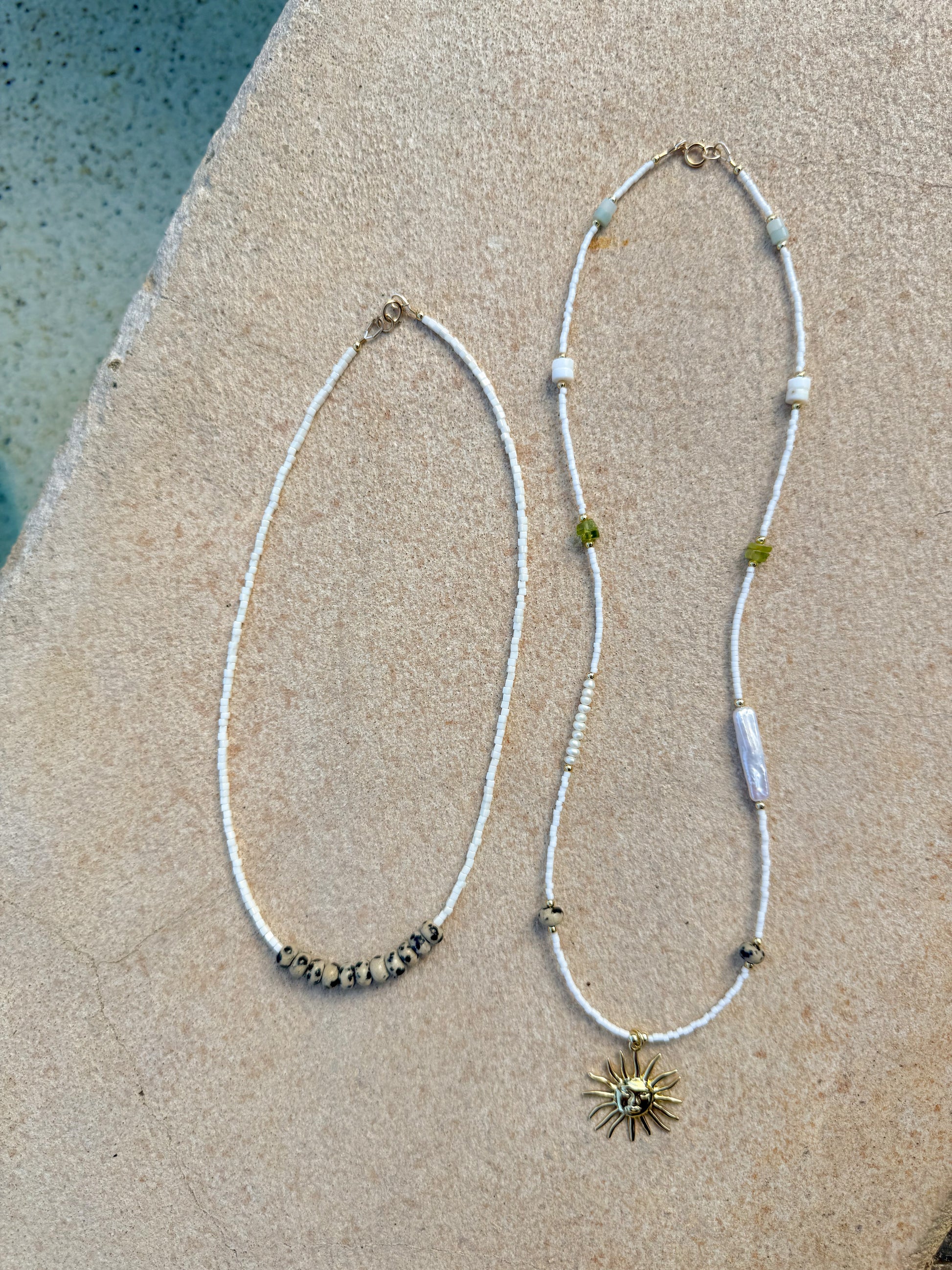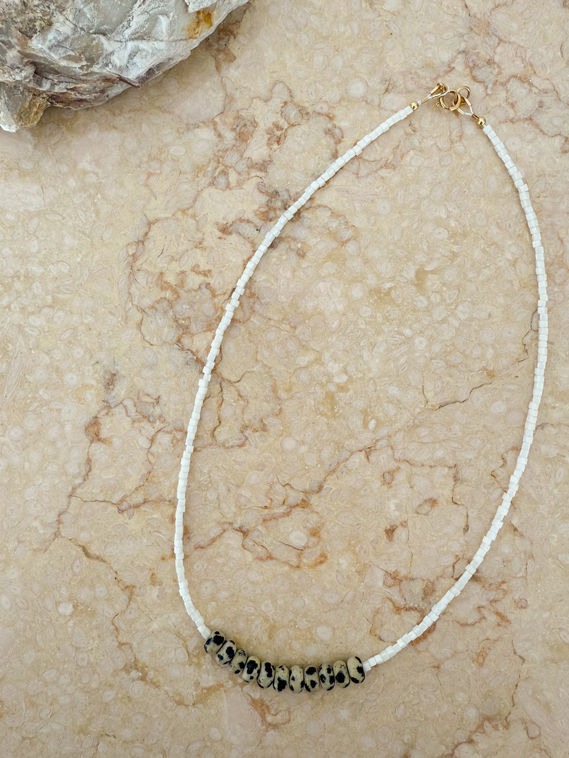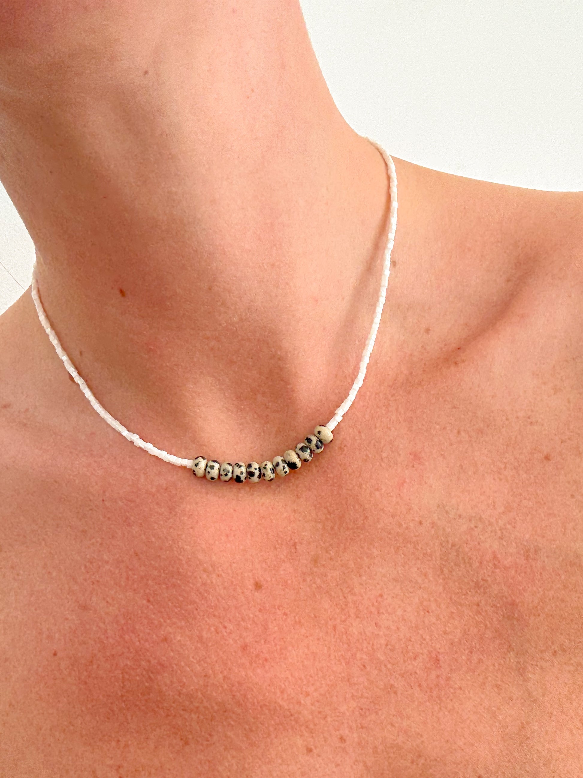 The Dotty features distinctive Dalmatian rondelle beads paired with crisp white square seed beads, creating a striking monochrome design. Expertly crafted, this piece offers a sophisticated balance of texture and pattern, perfect for adding a contemporary edge to your accessory collection. Its unique combination ensures a standout look with versatile styling options.
