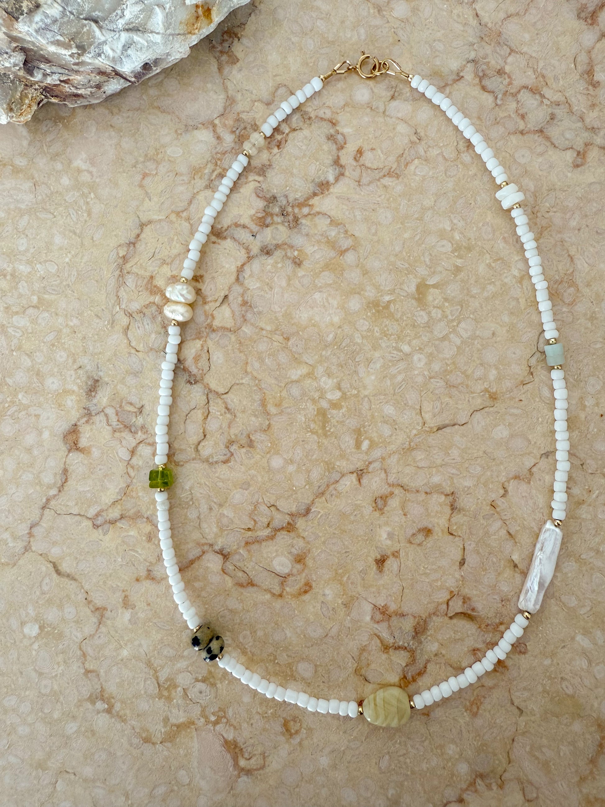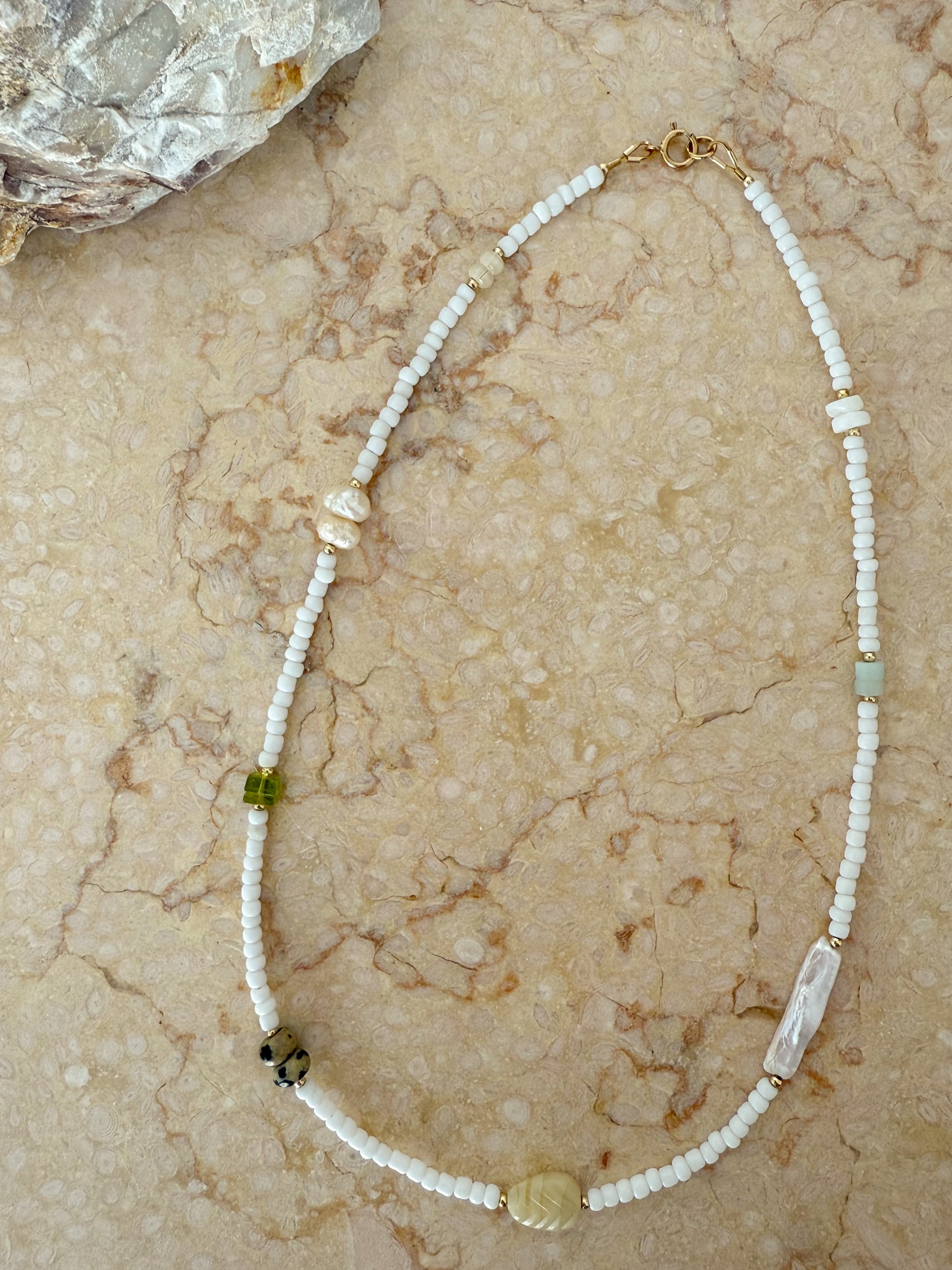 The Louise combines luminous freshwater pearls with white seed beads, complemented by carefully selected glass and stone beads. This beautiful arrangement highlights the natural beauty and subtle variations of each material, creating a sophisticated and textured piece. Perfect for those seeking timeless elegance with a refined, artisanal touch.