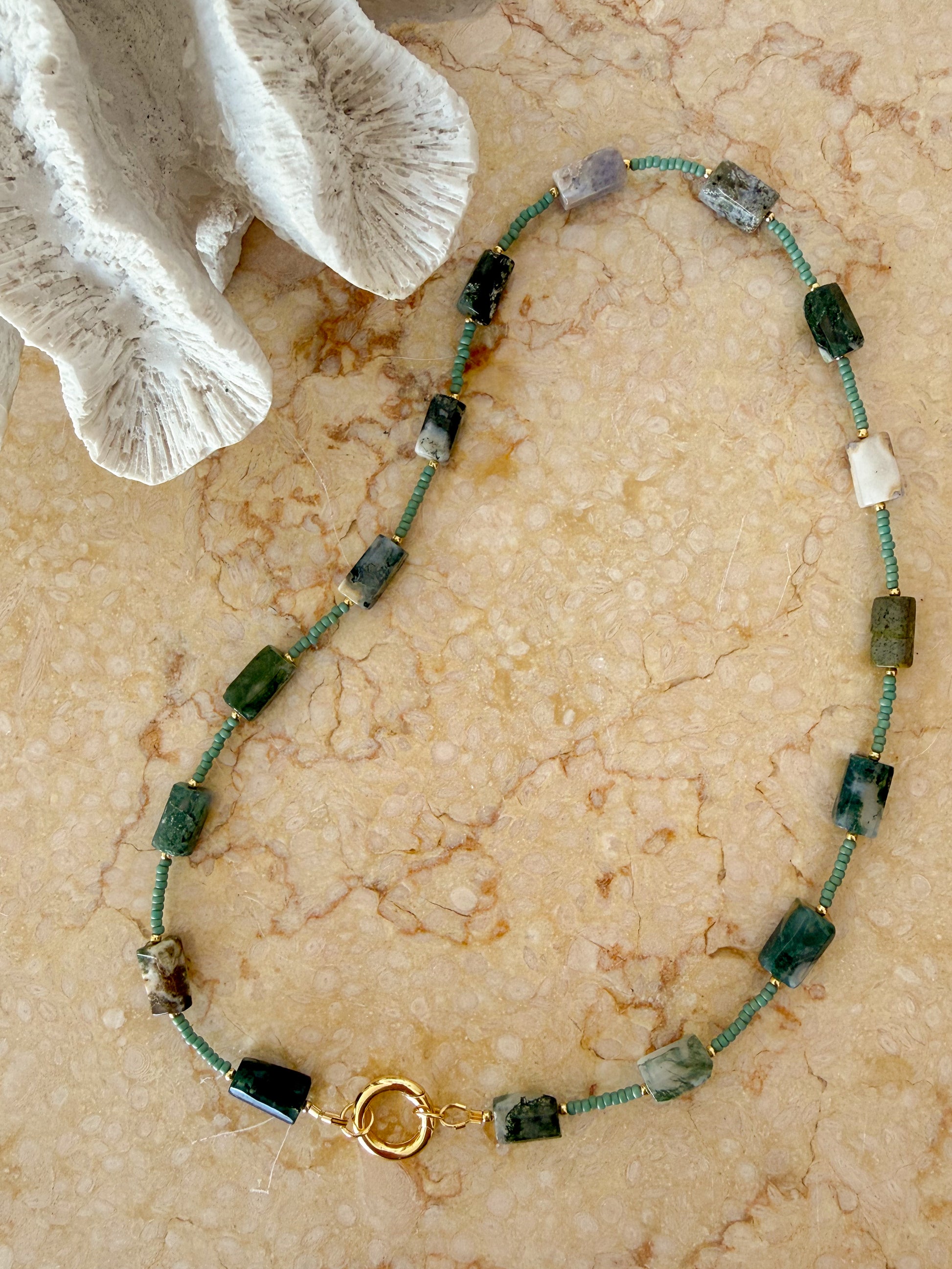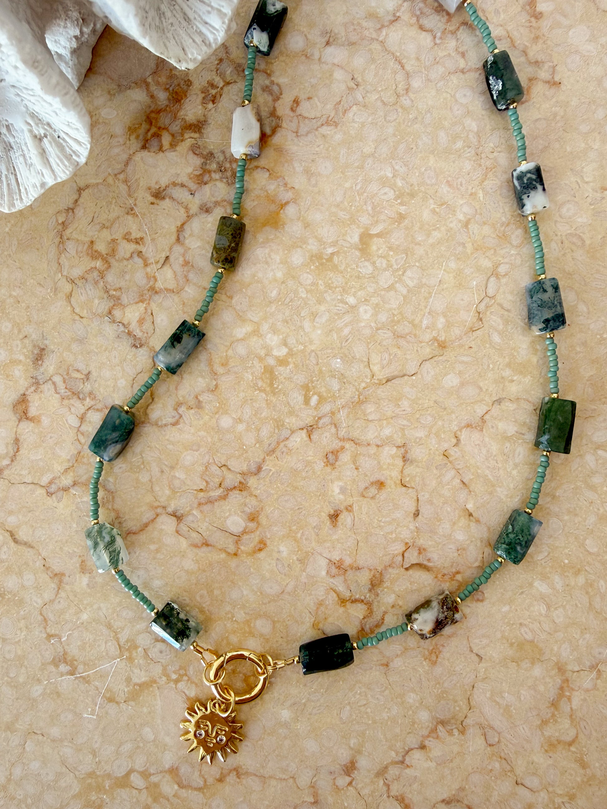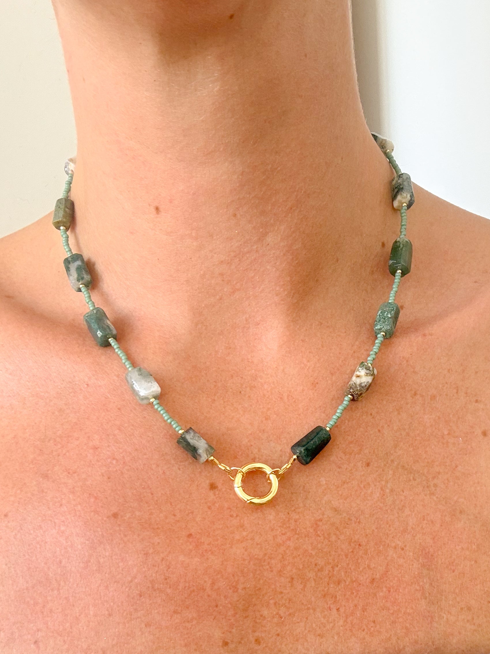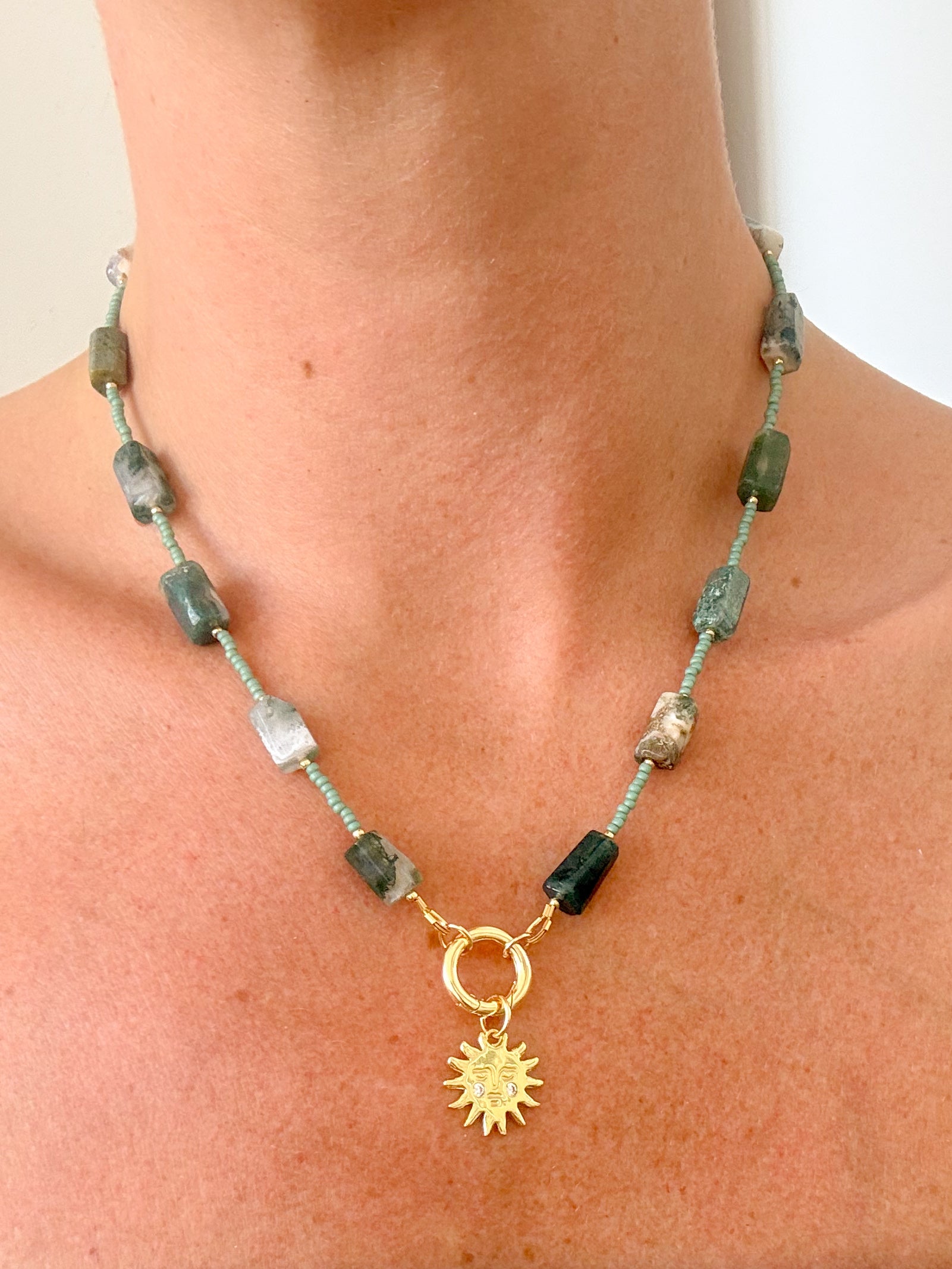 The Luna - Green is a handcrafted necklace featuring beautiful green seed beads paired with Indian agate barrel gemstone accents with gold detail. Charm sold separately.