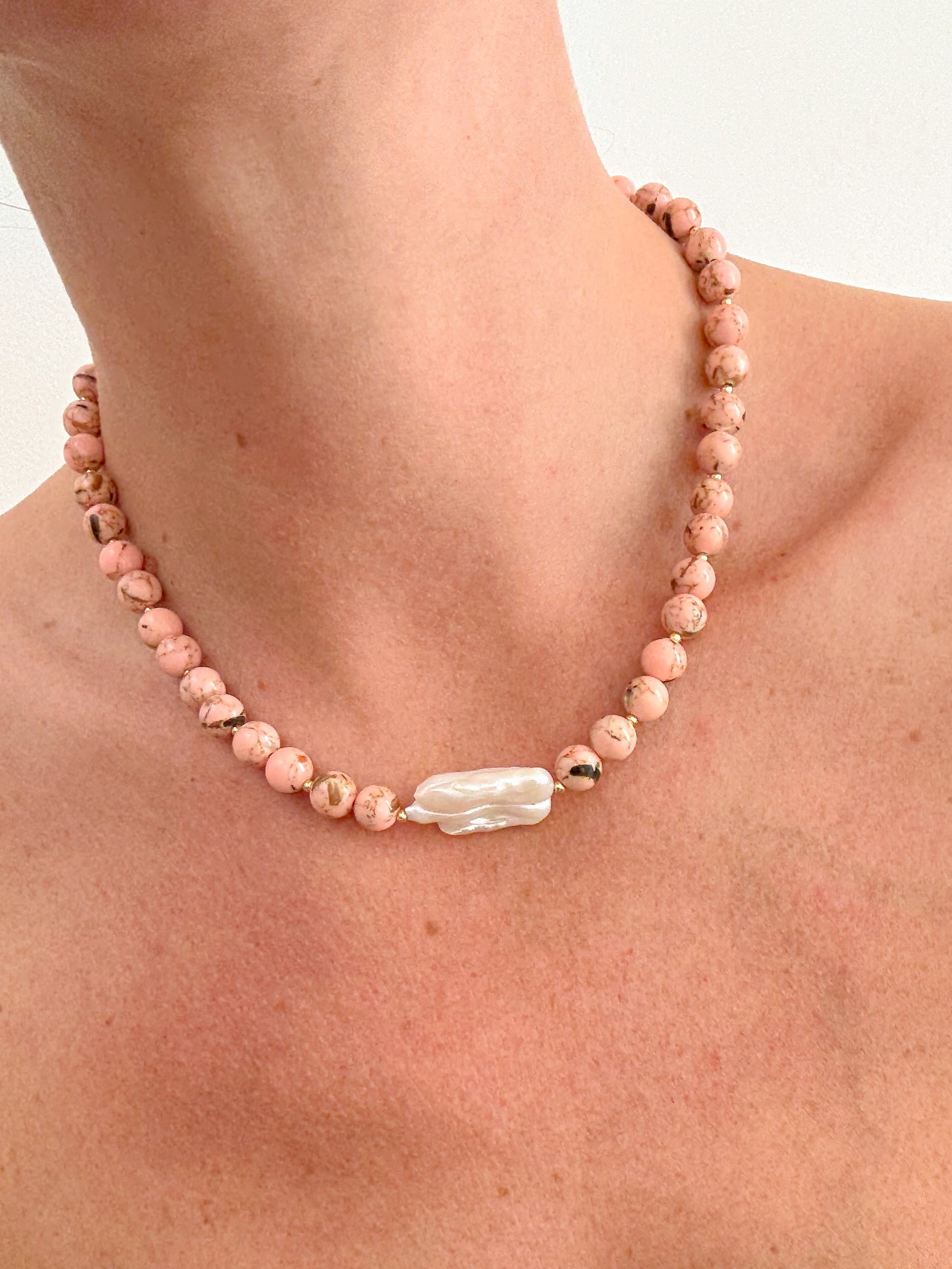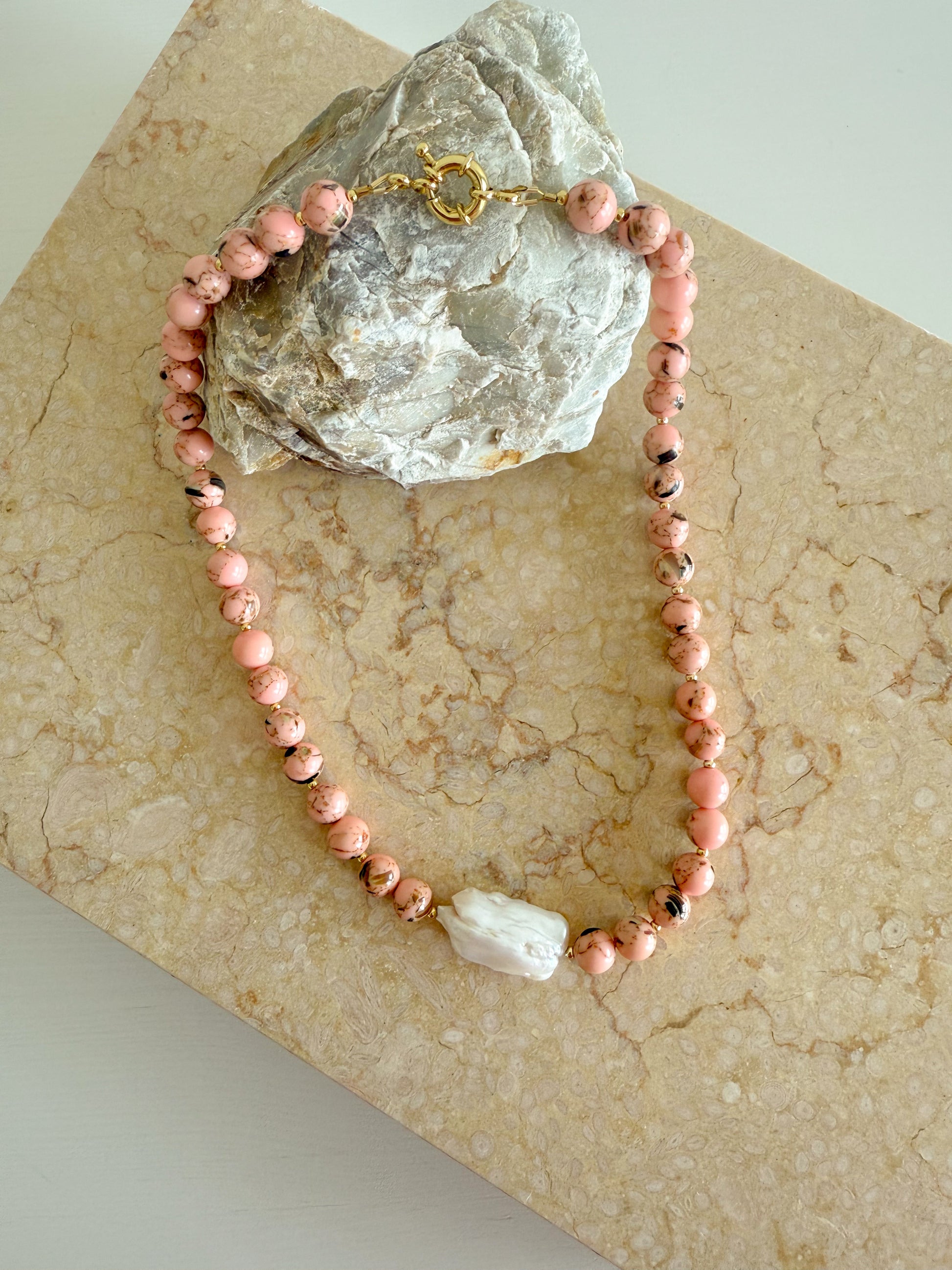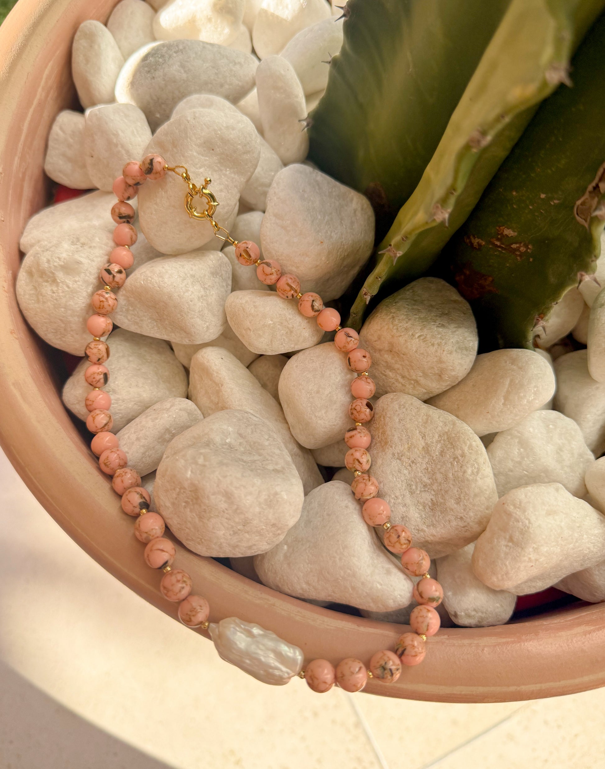 The Maureen showcases gold-filled finishings complemented with light pink stone beads featuring shell inlay. The design is enhanced with a freshwater pearl detail at the front, combining natural elements with refined metalwork for a sophisticated and timeless accessory, combined with gold filled spacer beads.