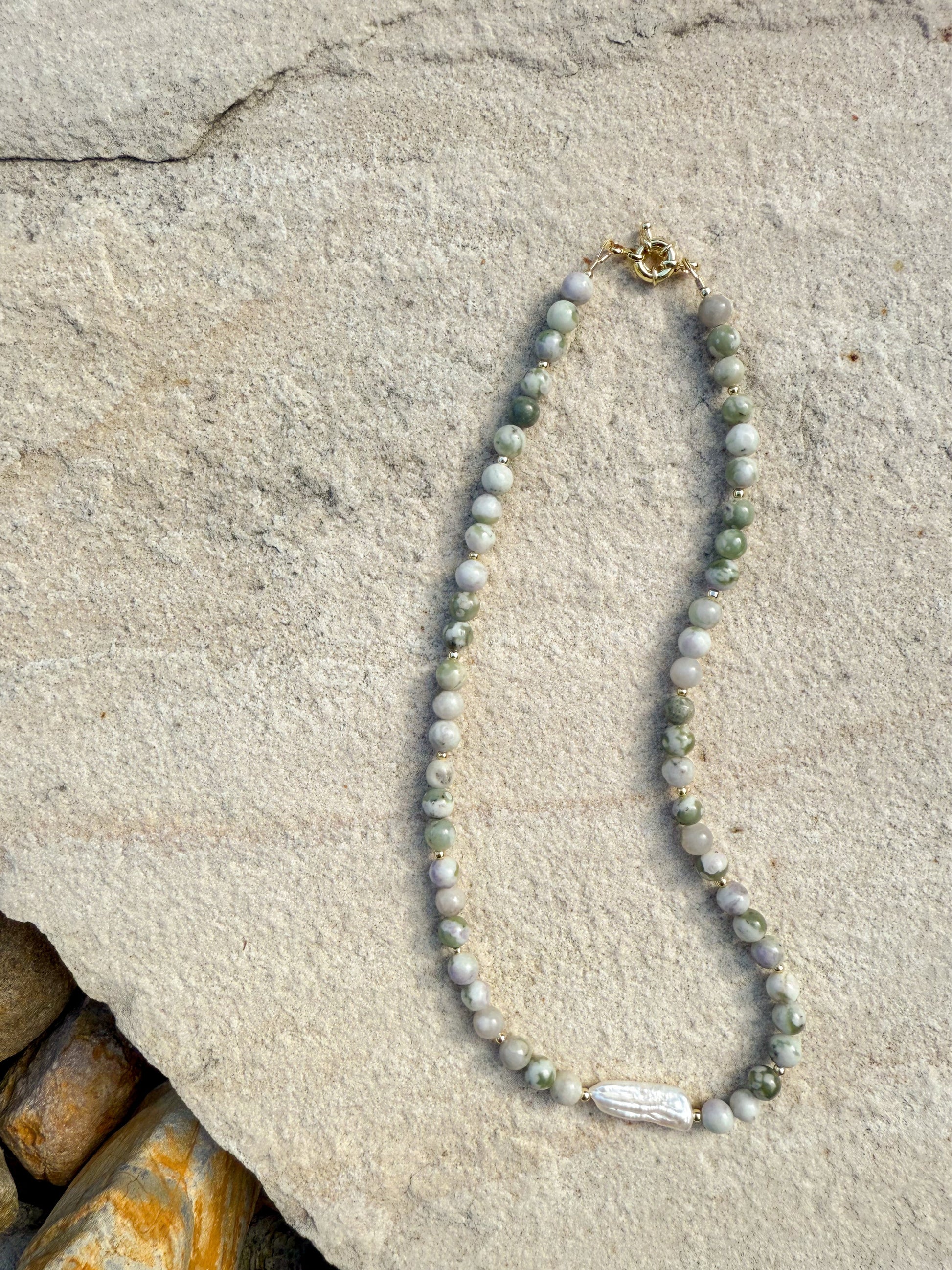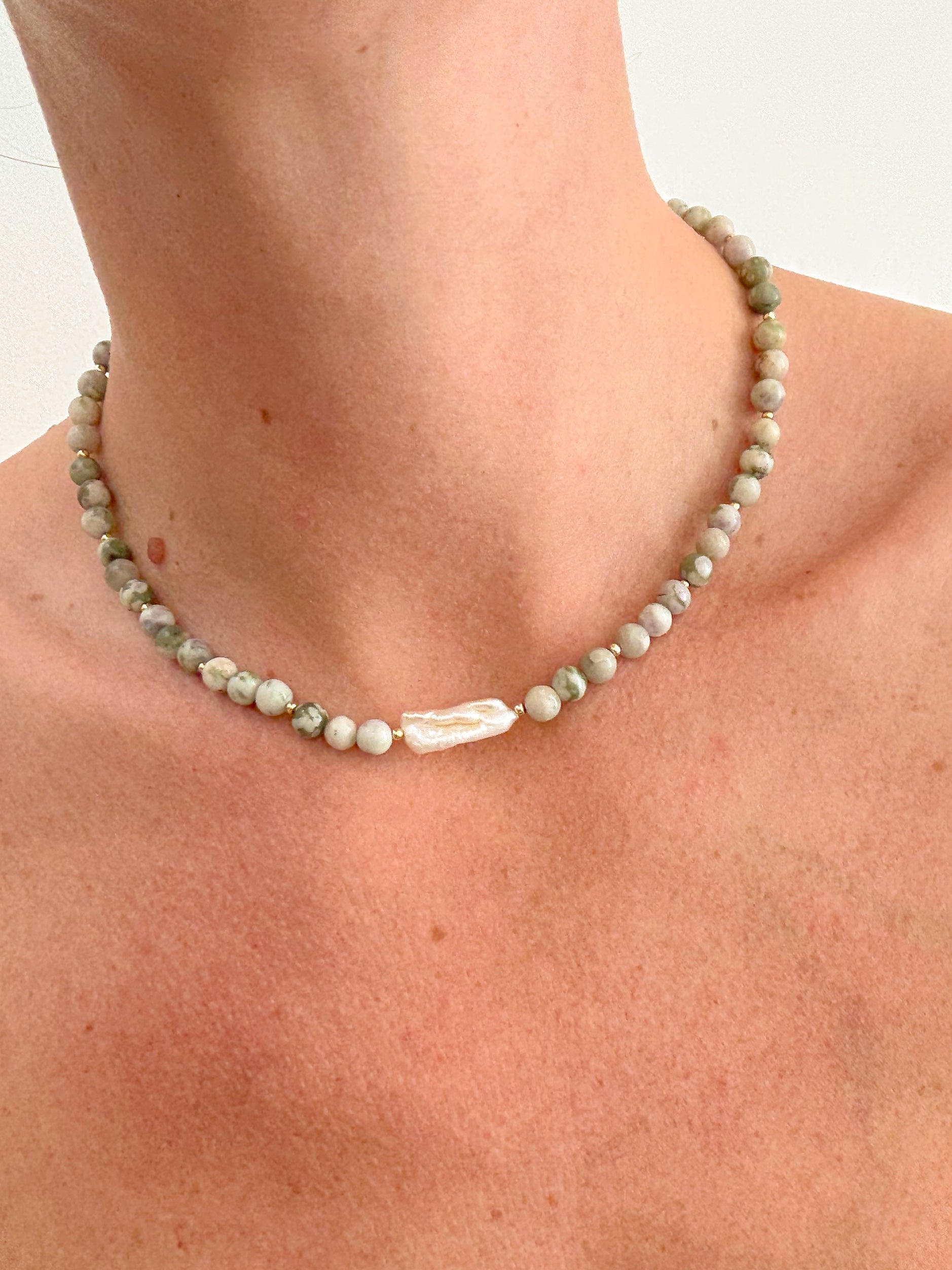 The Ruby combines green and white gemstone beads with beautiful gold-filled accents, highlighted by a freshwater pearl detail at the front. This gorgeously crafted design balances natural colour contrasts with refined metallic highlights, delivering a sophisticated statement piece.
