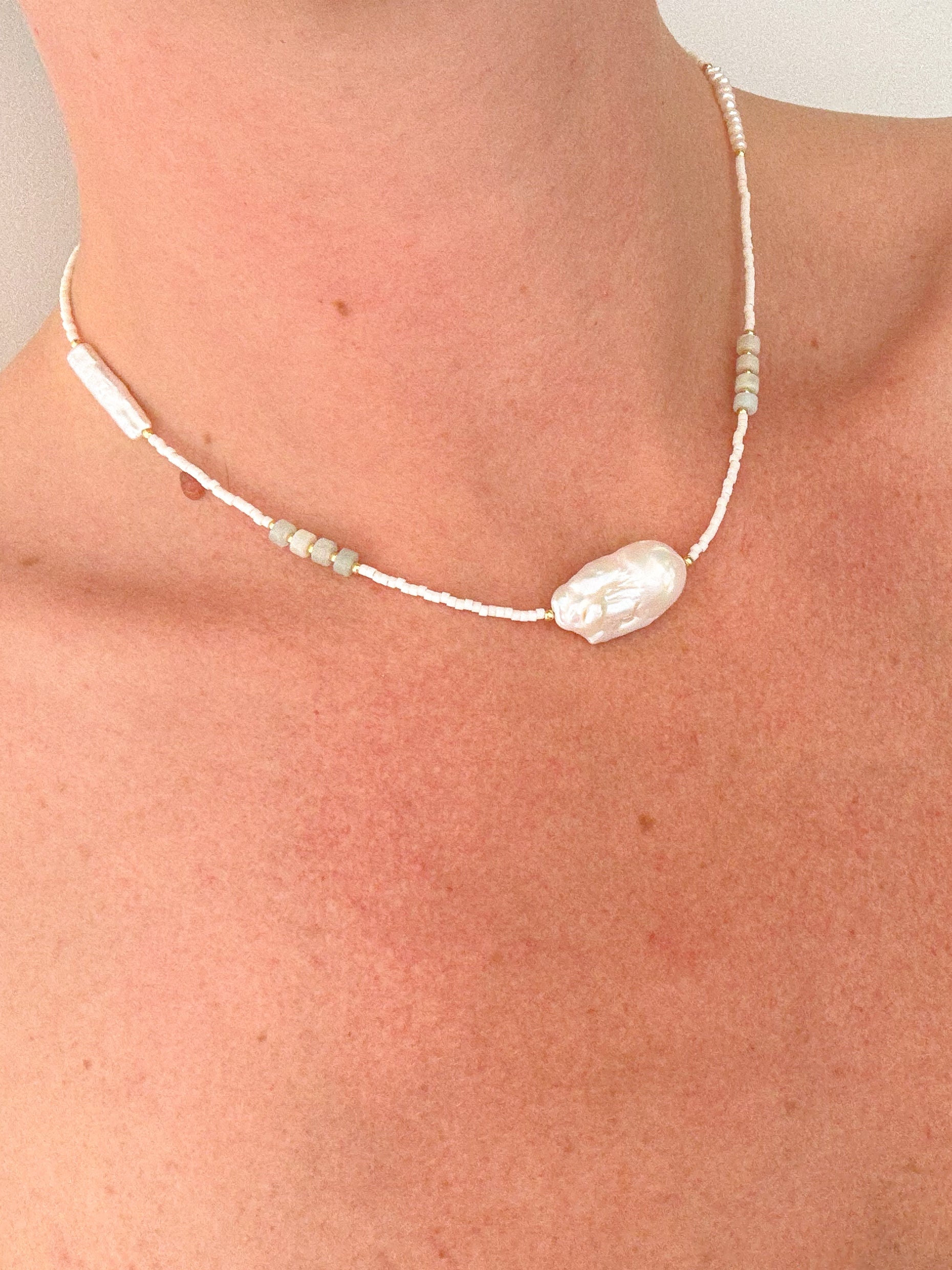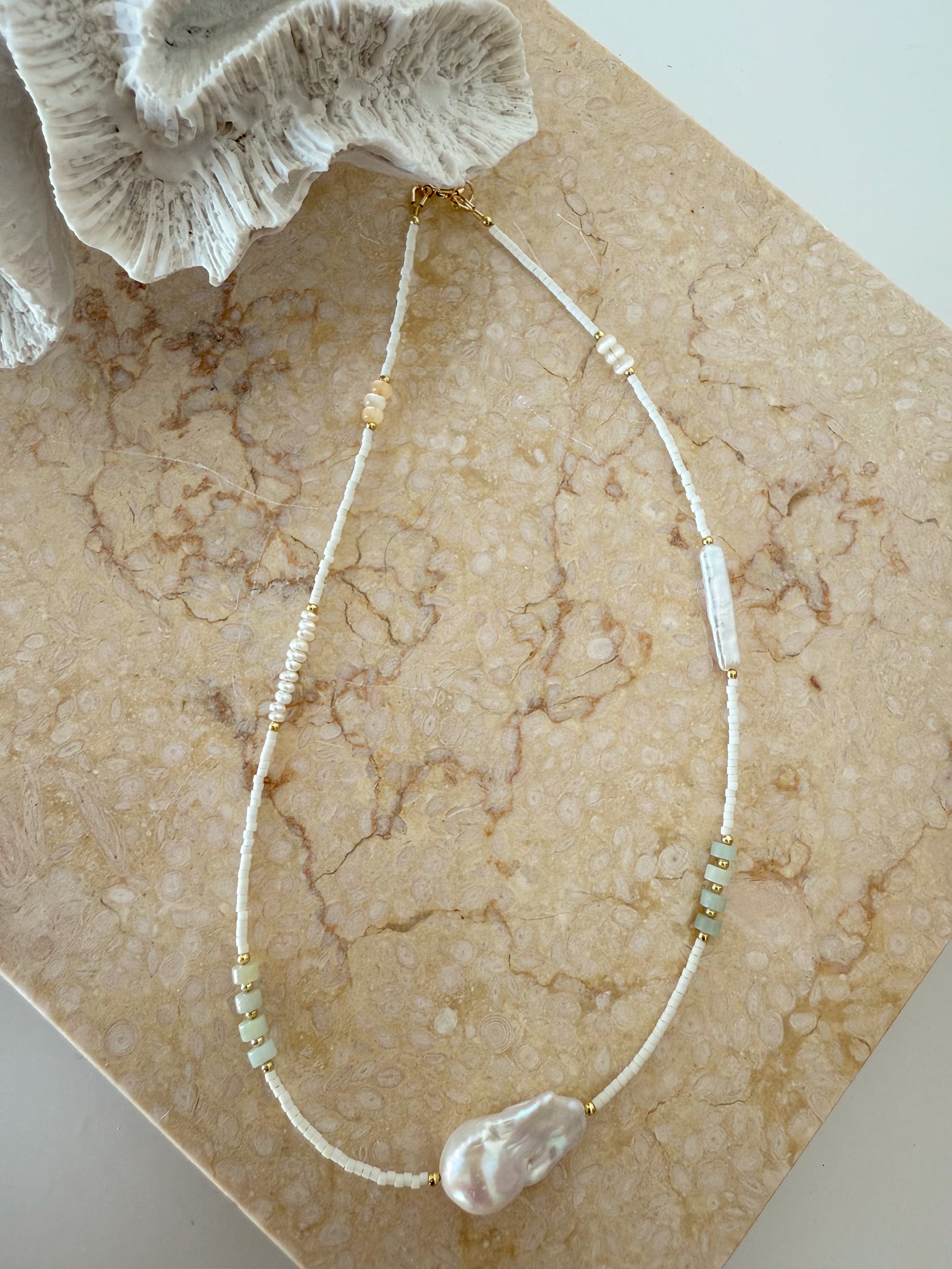 Elevate your accessory collection with The Ella necklace, showcasing white seed beads intricately combined with freshwater pearls and mixed glass bead accents. This expert-crafted piece is distinguished by a striking Baroque freshwater pearl centrepiece, offering a unique blend of texture and elegance for a refined, contemporary look.