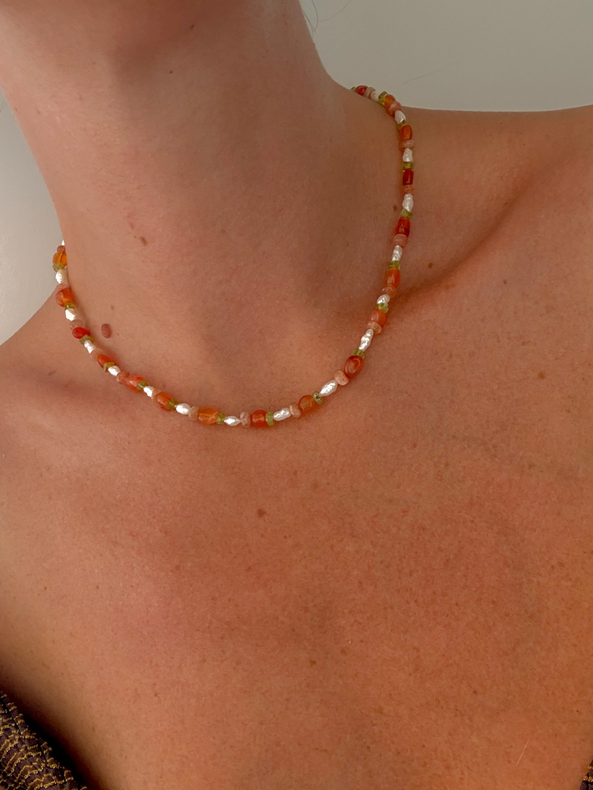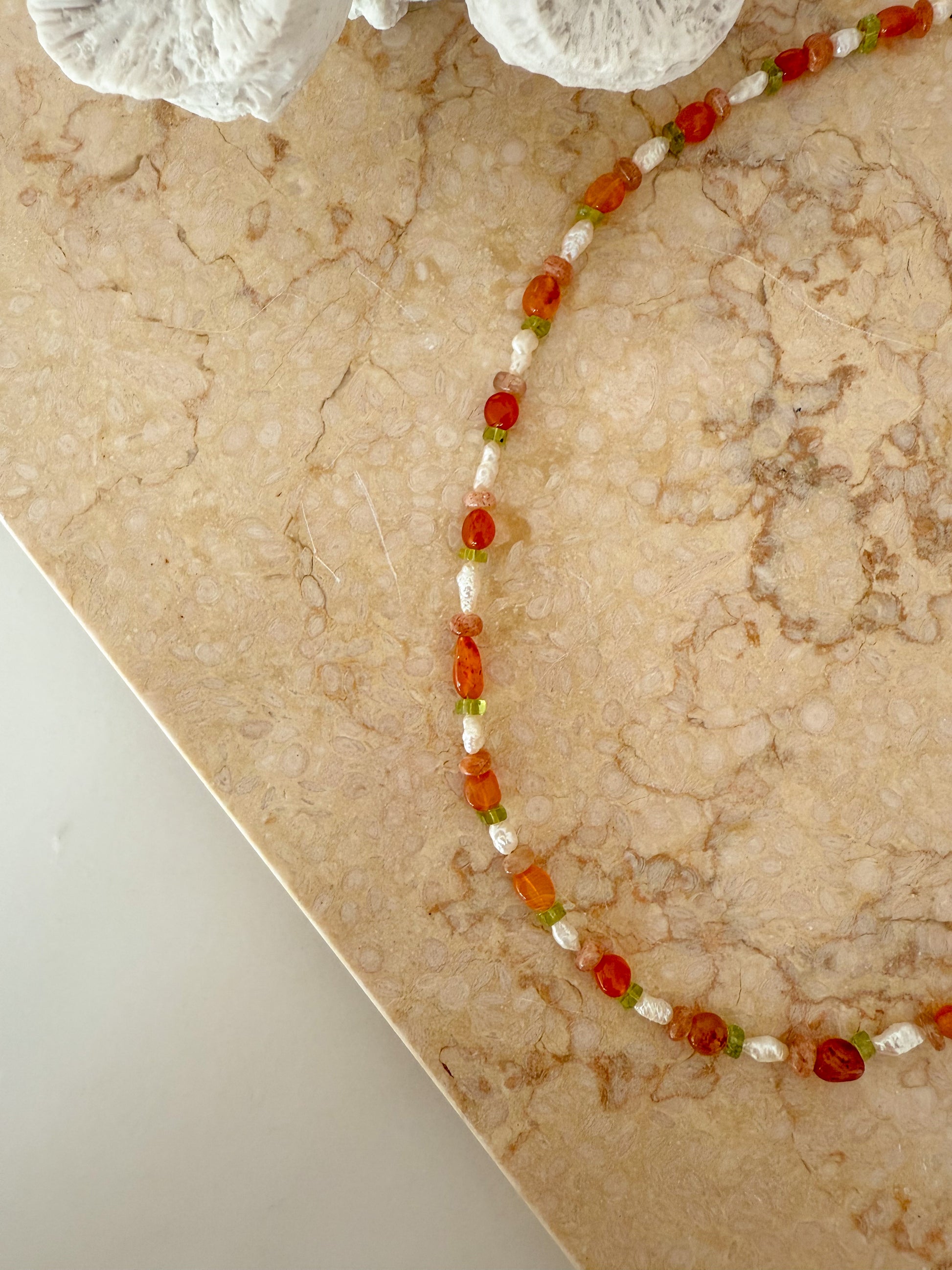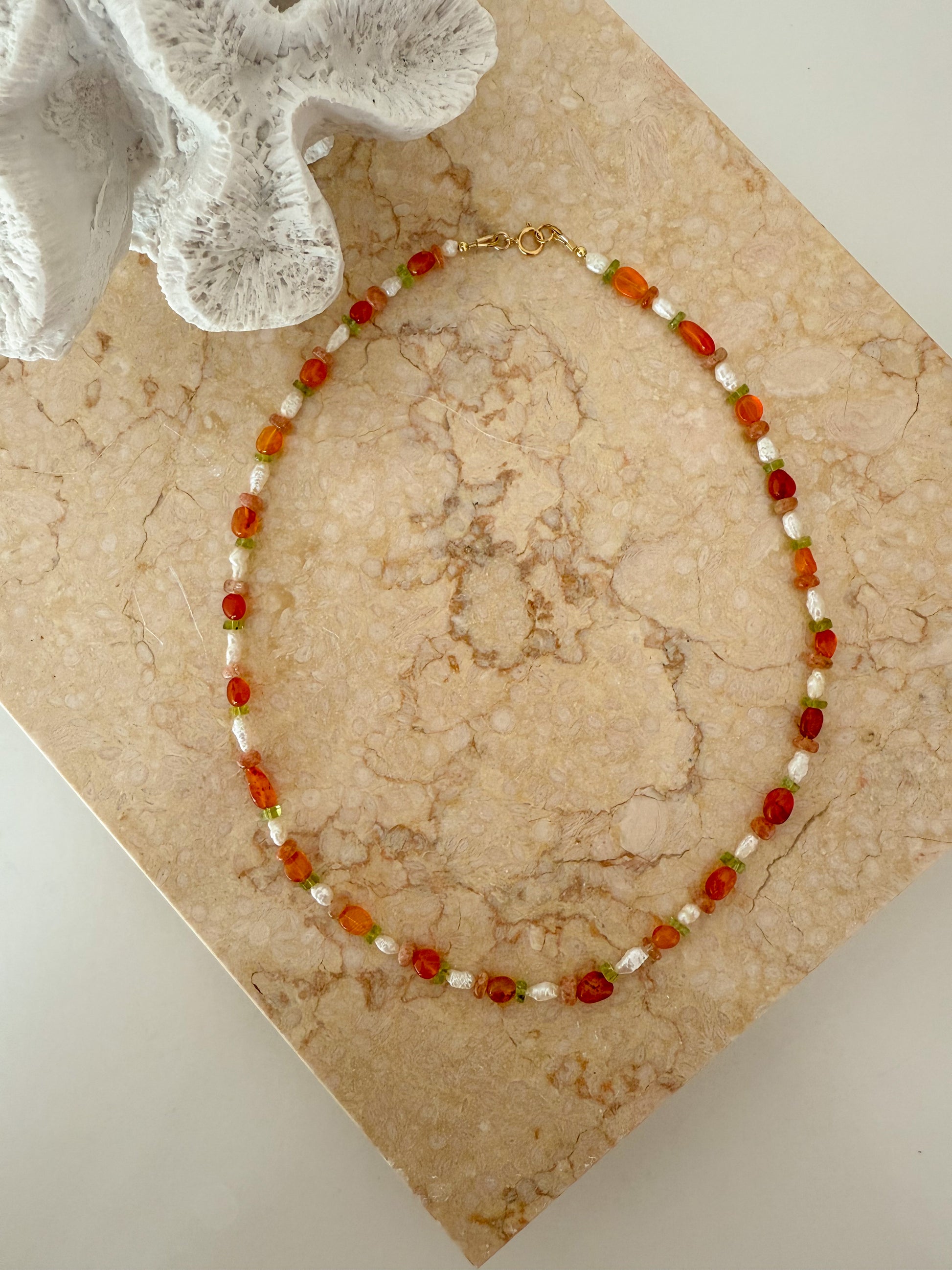 Expertly crafted with natural peridot, carnelian, sun stone, and freshwater pearls, The Poppy necklace is a stunning addition to any jewellery collection. Embrace the beauty of these natural gemstones in a beautifully designed necklace that is sure to elevate any outfit.