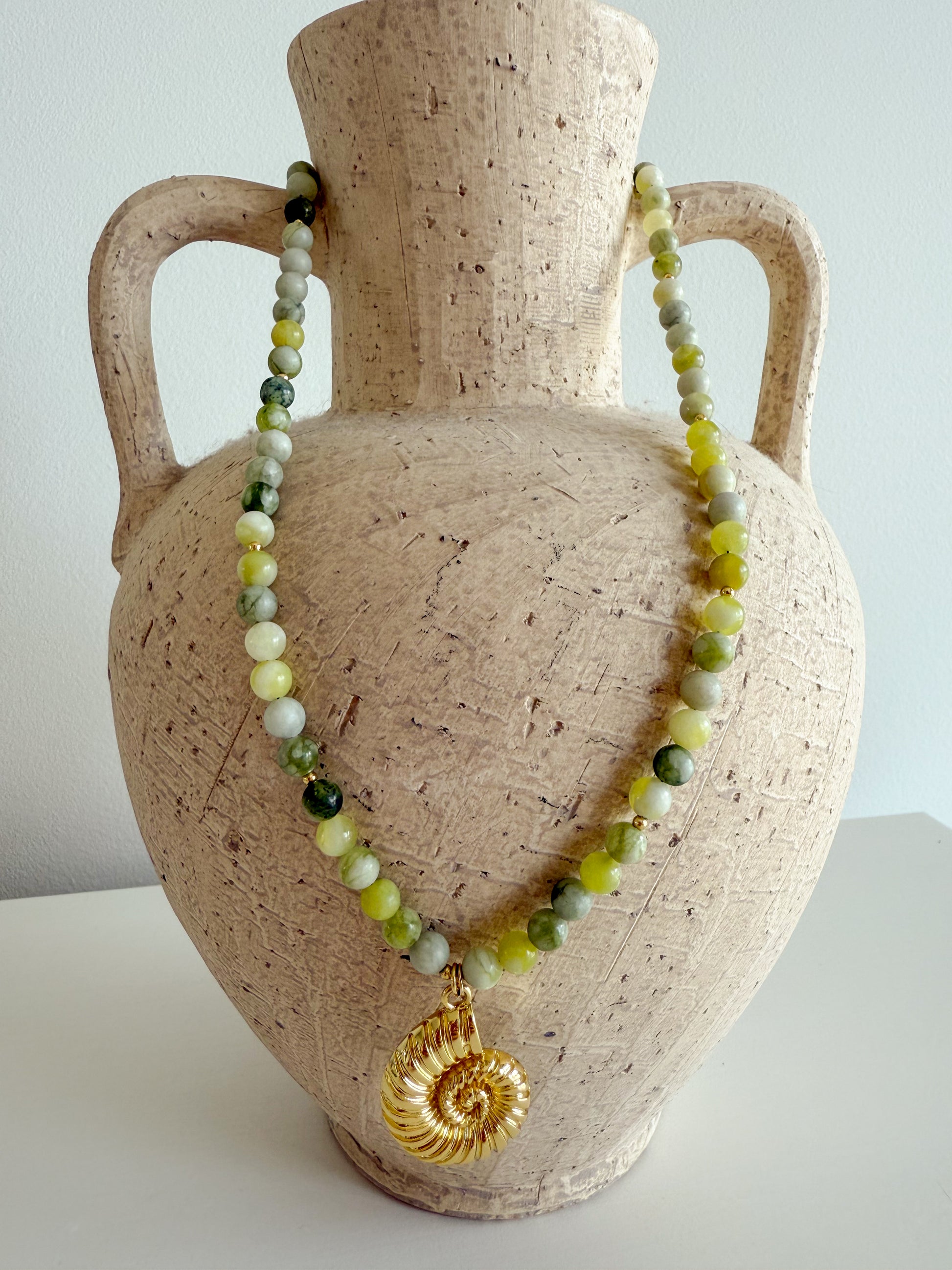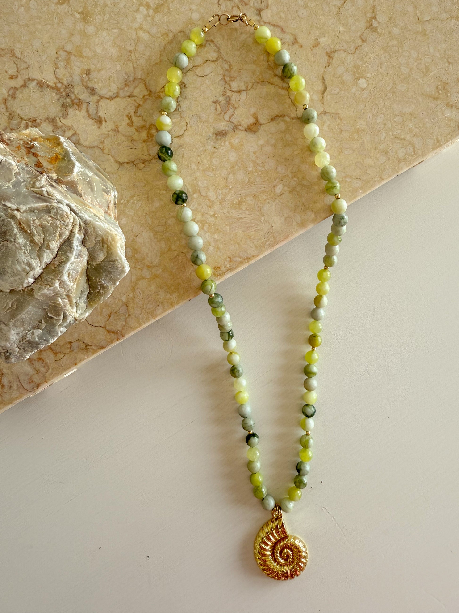 The Ray showcases earthy green gemstone beads highlighted with refined gold filled detailing, creating a harmonious, natural aesthetic. Finished with an 18k gold filled conch shell pendant, this piece combines quality materials for a sophisticated, nature-inspired accessory.
