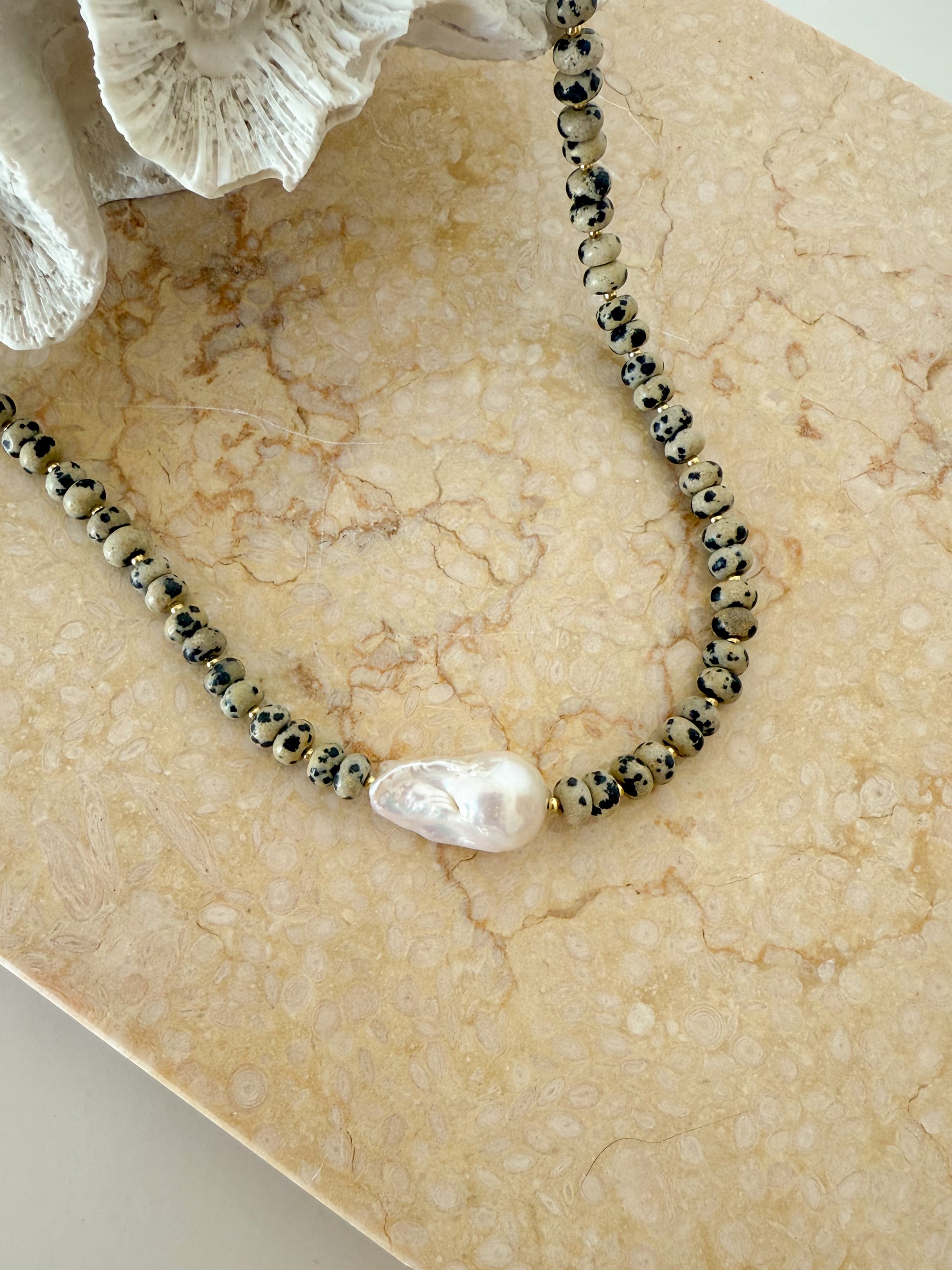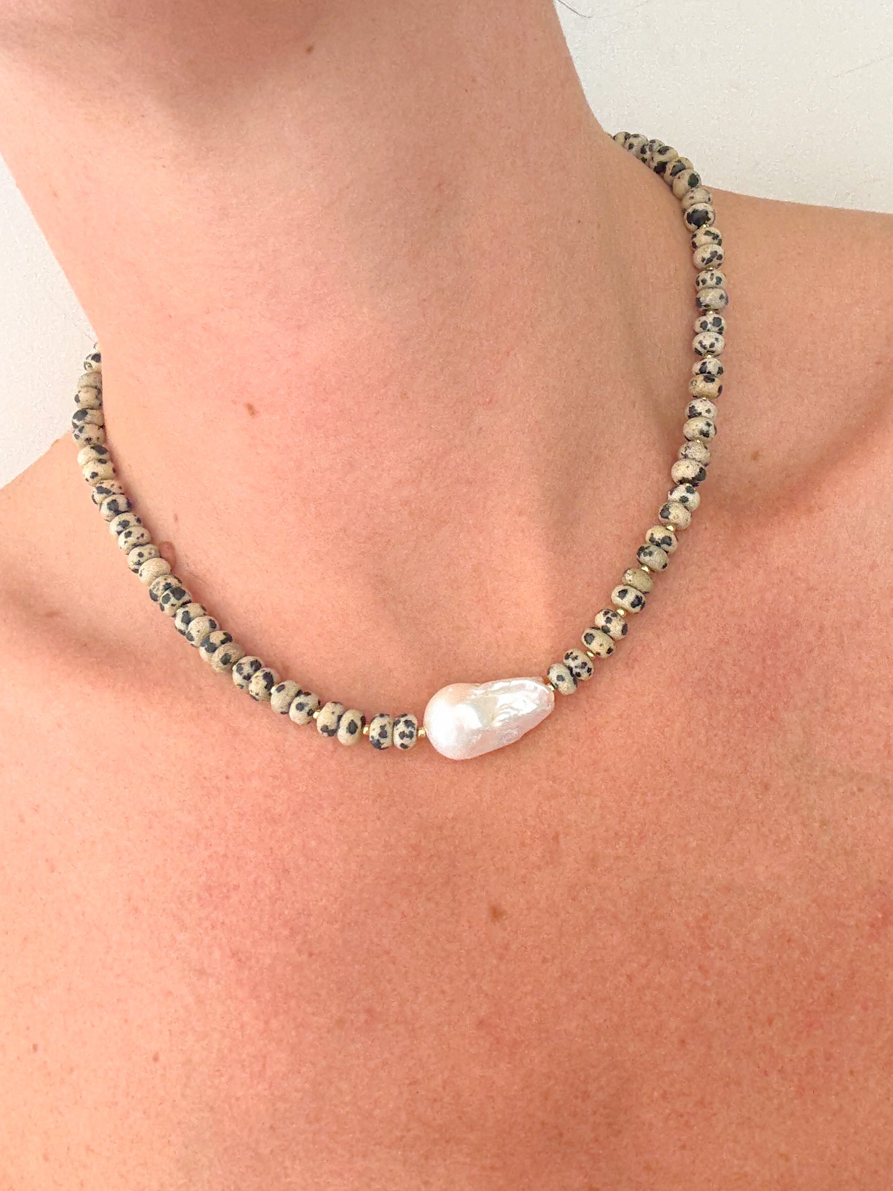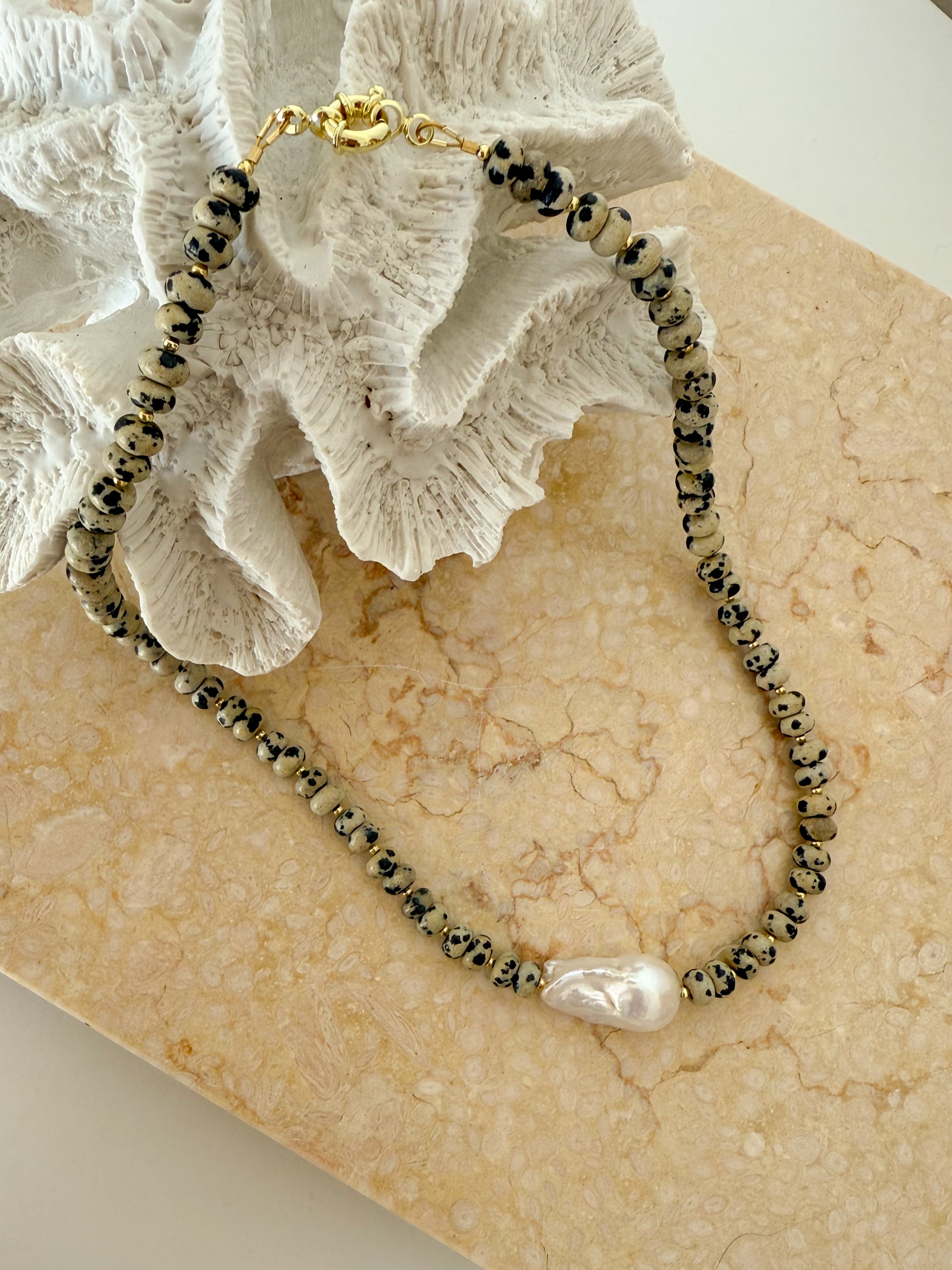 The Bobbie showcases distinctive Dalmatian rondelle beads paired with refined gold-filled detailing, featuring a Baroque freshwater pearl at the front. This design expertly blends bold patterning with elegant accents, creating a unique piece that stands out with natural beauty and sophistication.