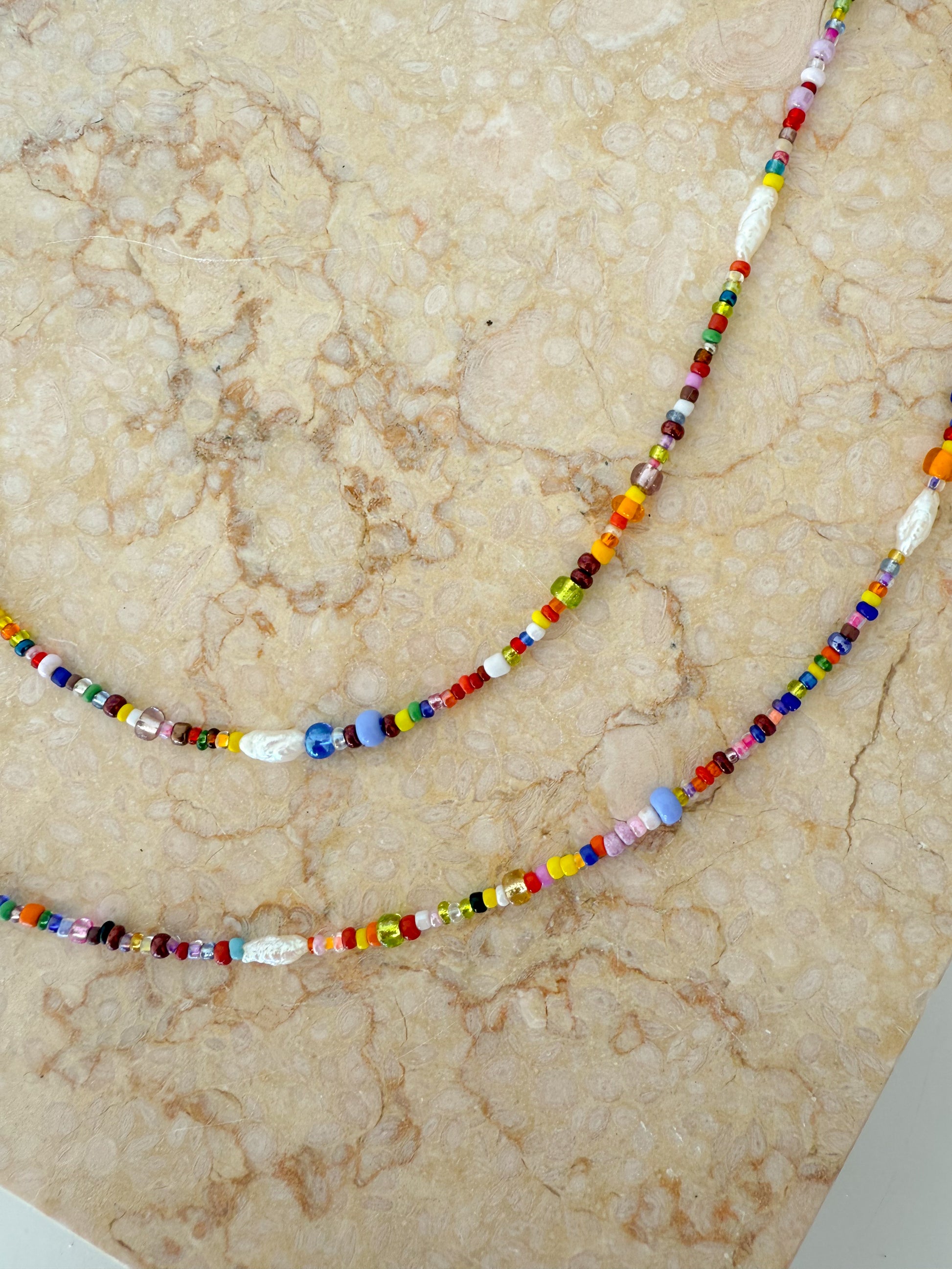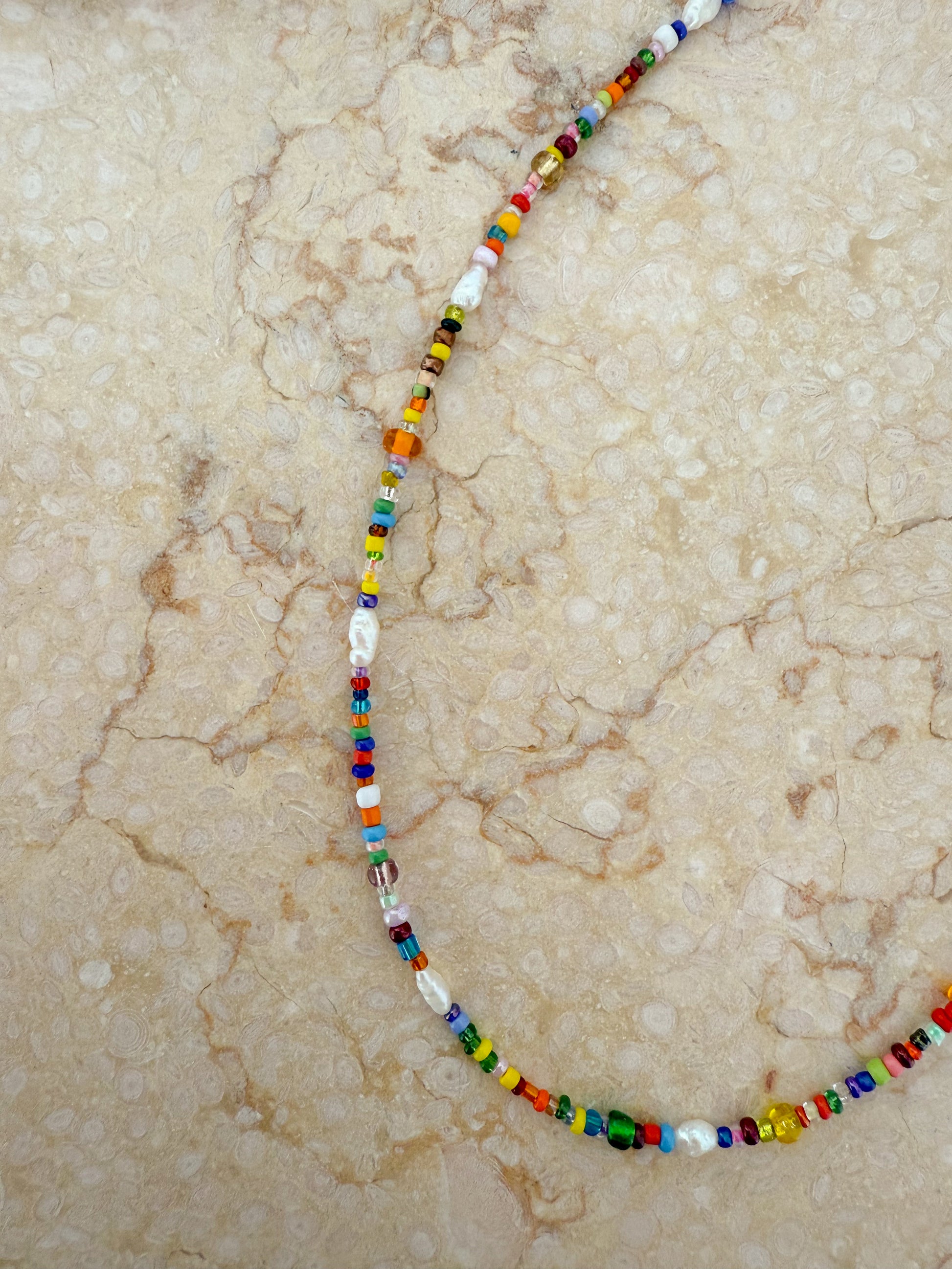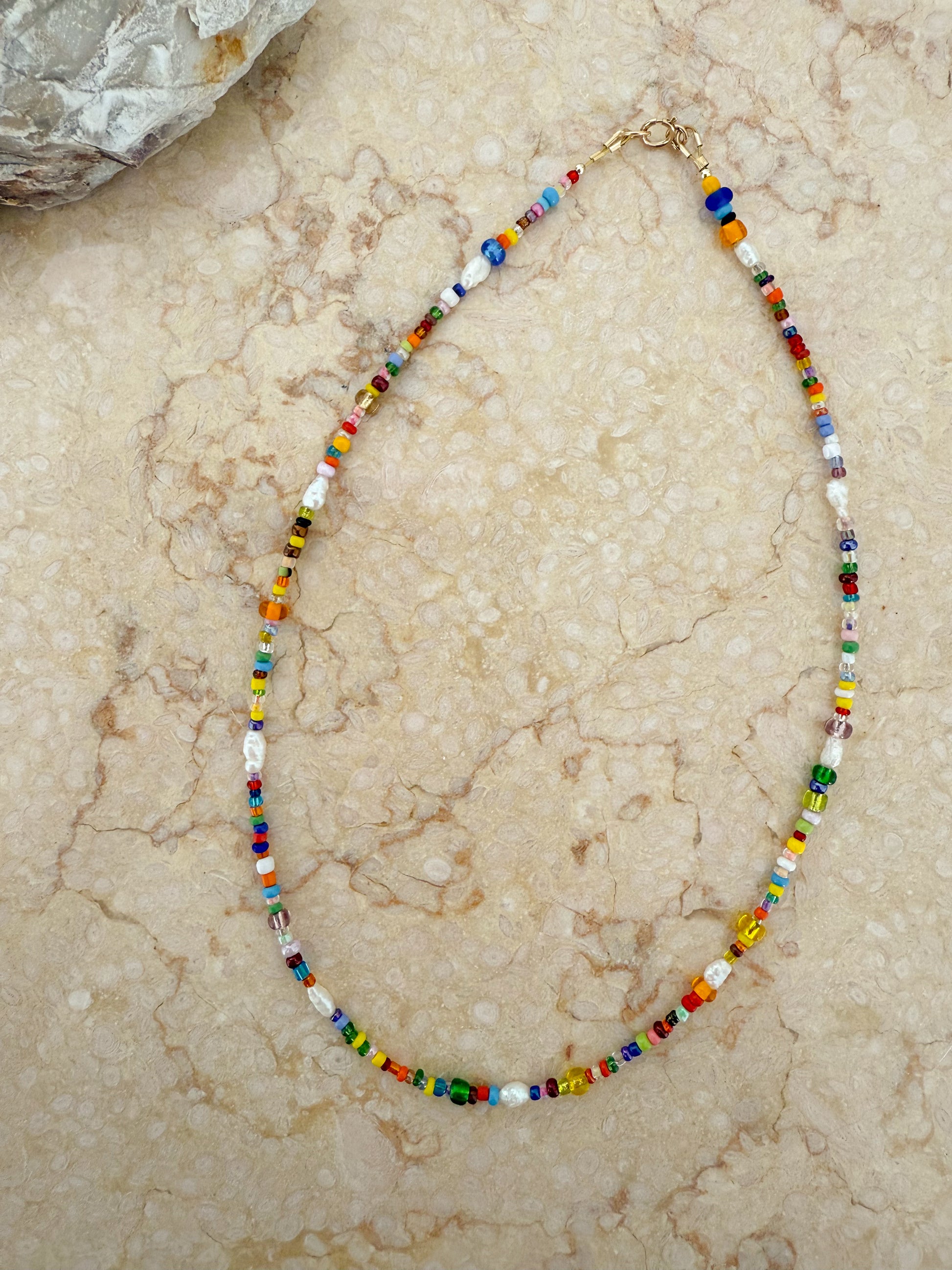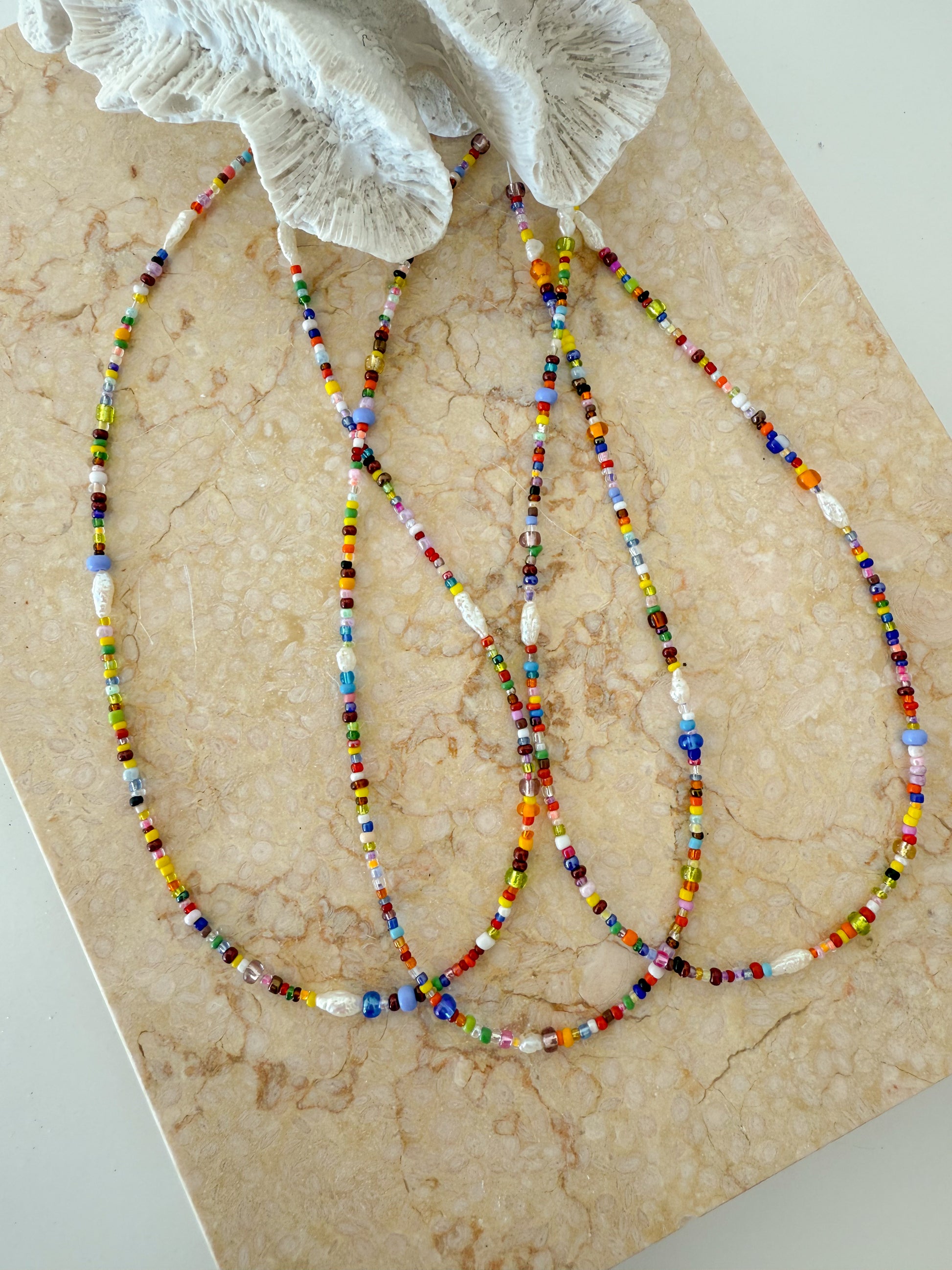 This beautifully crafted necklace features a vibrant array of colourful seed beads complemented by delicate freshwater pearl accents. The harmonious blend of bright hues and natural pearls creates a striking yet elegant accessory, perfect for adding a refined touch of coastal charm to any outfit.