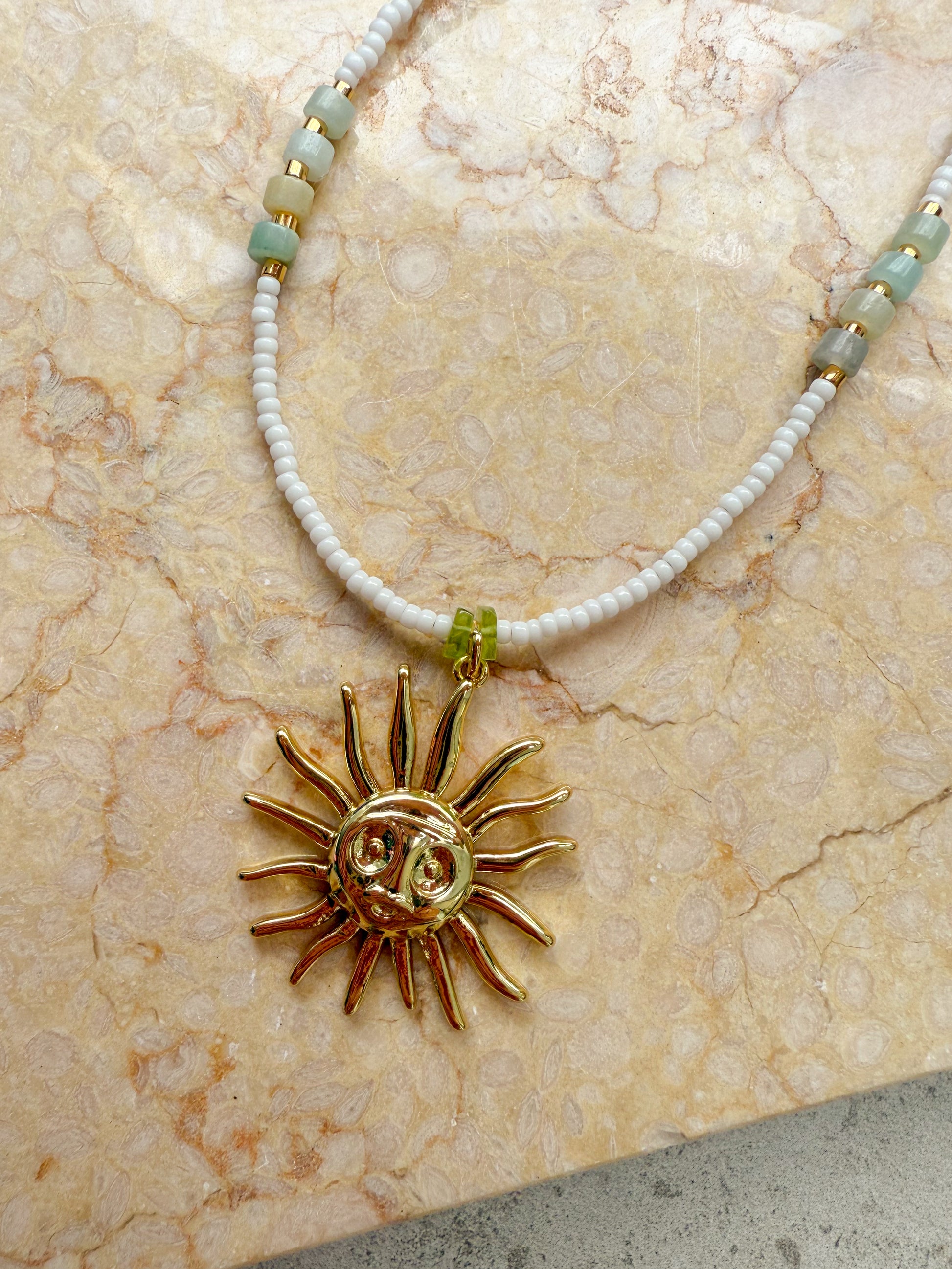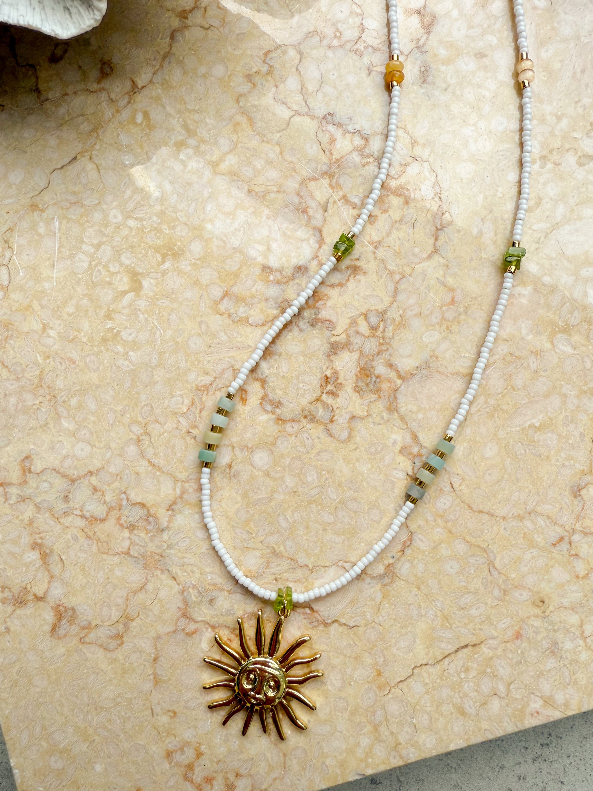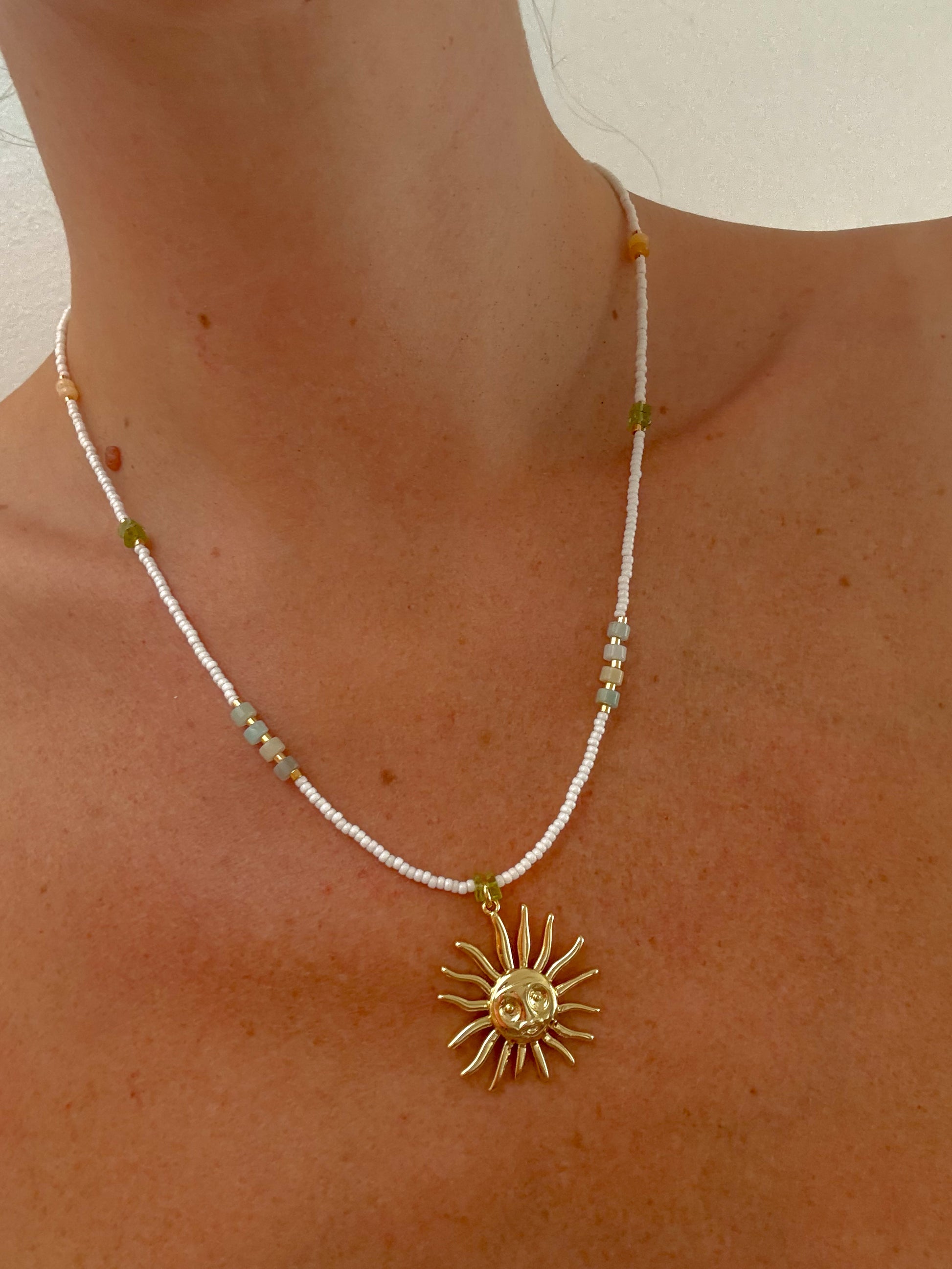 The Susan features delicate white seed beads combined with a variety of natural stone beads and lustrous freshwater pearls, offering a refined and textured aesthetic. This elegant piece is finished with a gold filled sun pendant, adding a subtle touch of warmth and sophistication. Expertly crafted, it balances organic elements with graceful design, making it a versatile accessory for both everyday wear and special occasions.